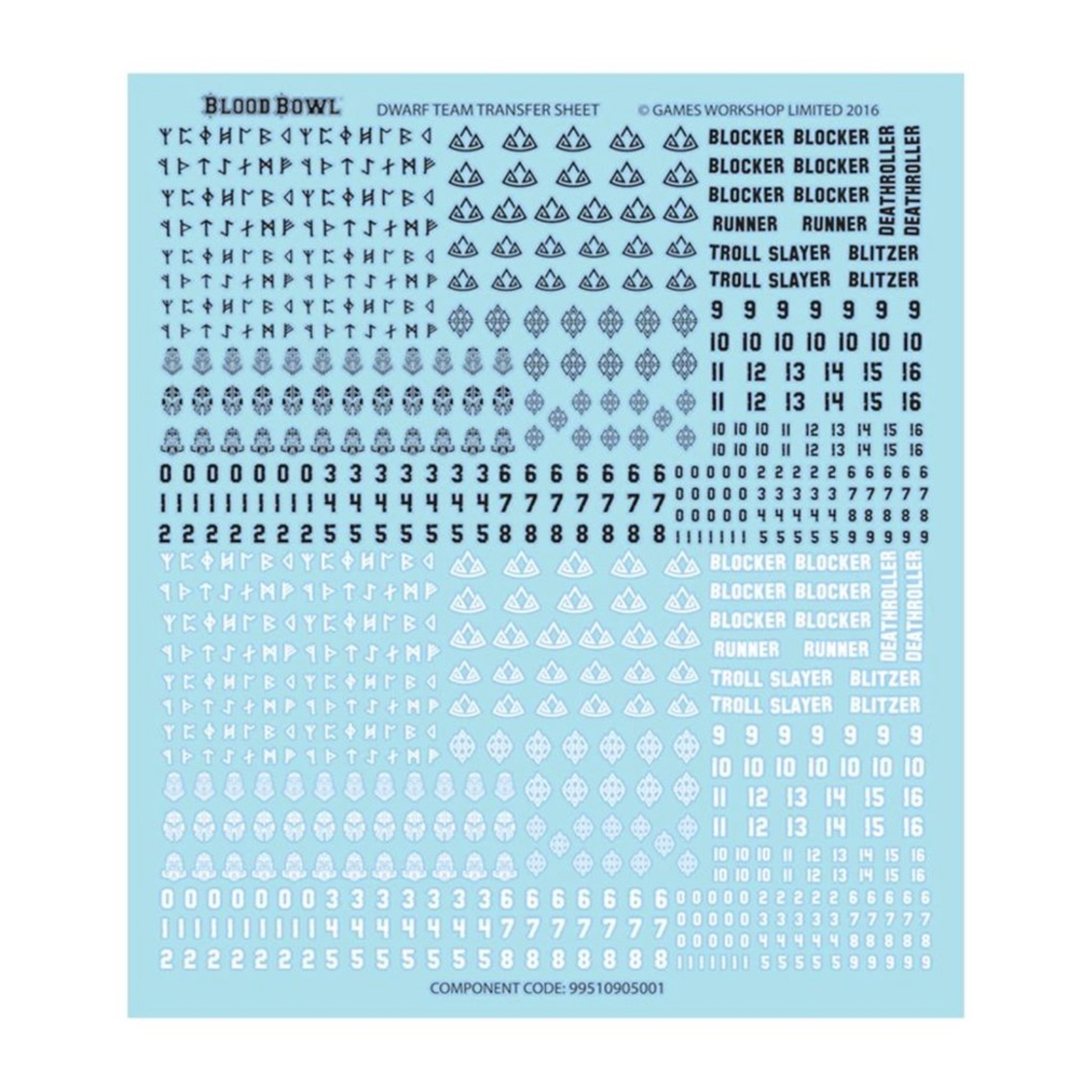 C’è anche un foglio di trasferibili con i simboli dei Dwarf Giants, una scheda da 1.000.000 gp che consente a un allenatore di usare il team così com’è nella scatola, e 12 basette da 32mm.