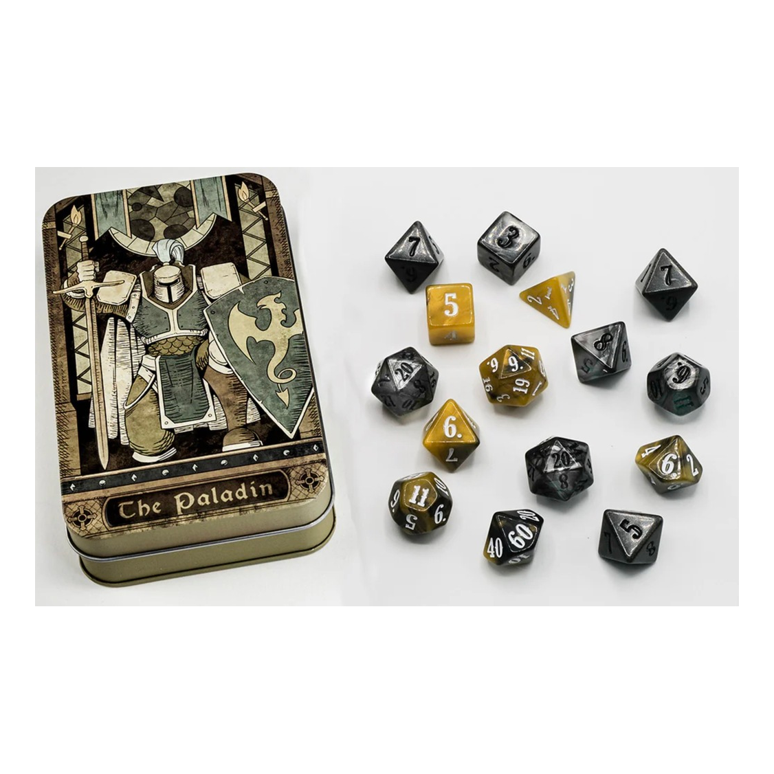 Open this tin and unleash 15 dice in two color designs, with d8s for smiting and an extra d6 and d12 for the weapon damage from your mighty blades.