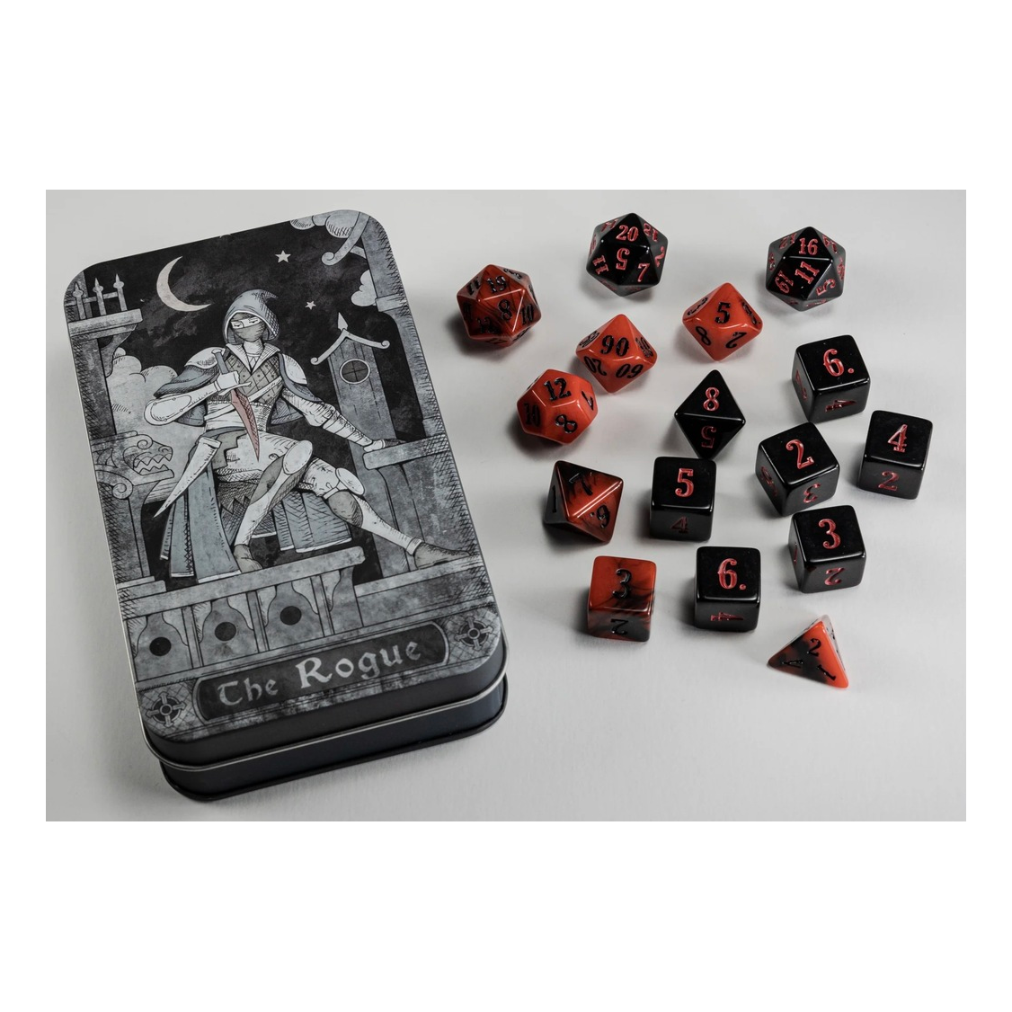 Pick the lock on this tin to reveal 16 dice in two color design, with tons of d6s for the stabbing, as well as extra d20s for scurrying about in the shadows and the advantage rolls that it brings.