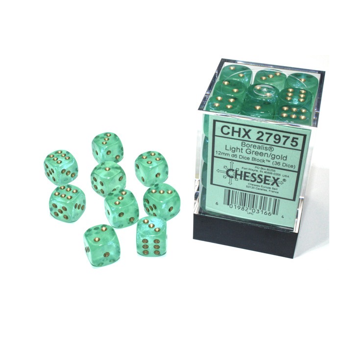 Each Set contains 36 Borealis Light Green 12mm d6 dice with gold pips (DB1275) in 02804 Display Case w/Lid This color has our Luminary™ effect. It can look like stars in the dark (with enough light exposure beforehand or under a black light).