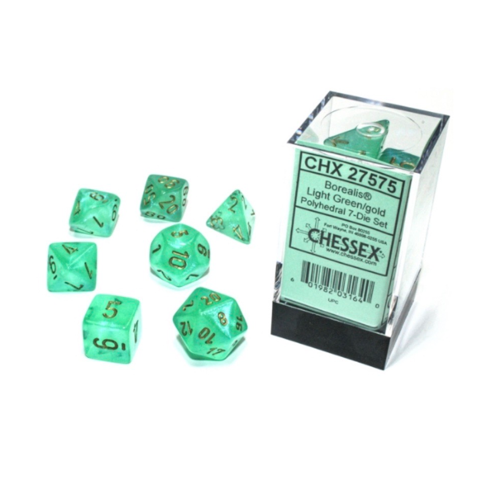 Chessex – Borealis Light Green/gold Luminary Polyhedral 7-Die Set (CHX27575)Disponibilità : Disponibile
