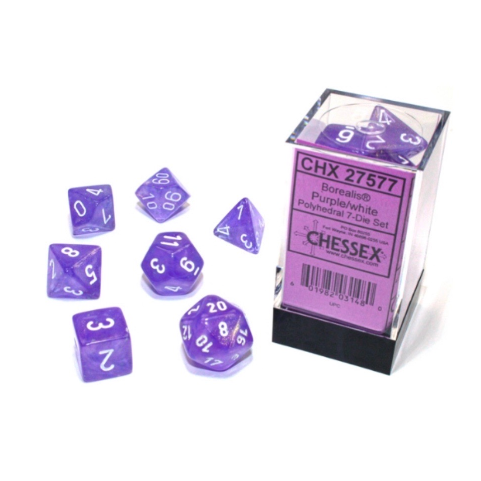 2884Chessex – Borealis Purple/white Luminary Polyhedral 7-Die Set (CHX27577)