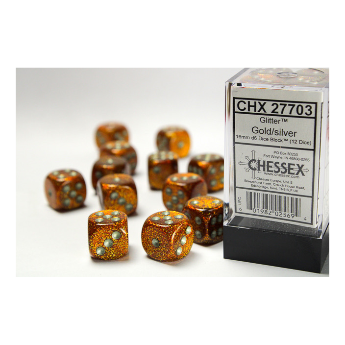 Chessex – Dice Block™ (12 Dice) 16mm d6 with pips Glitter Polyhedral Gold/silver (CHX27703)Disponibilità: Disponibile