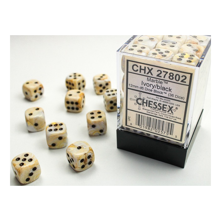 Chessex – Dice Block™ (36 Dice) 12mm d6 with pips Marble Ivory w/black (CHX27802)Disponibilità: Disponibile