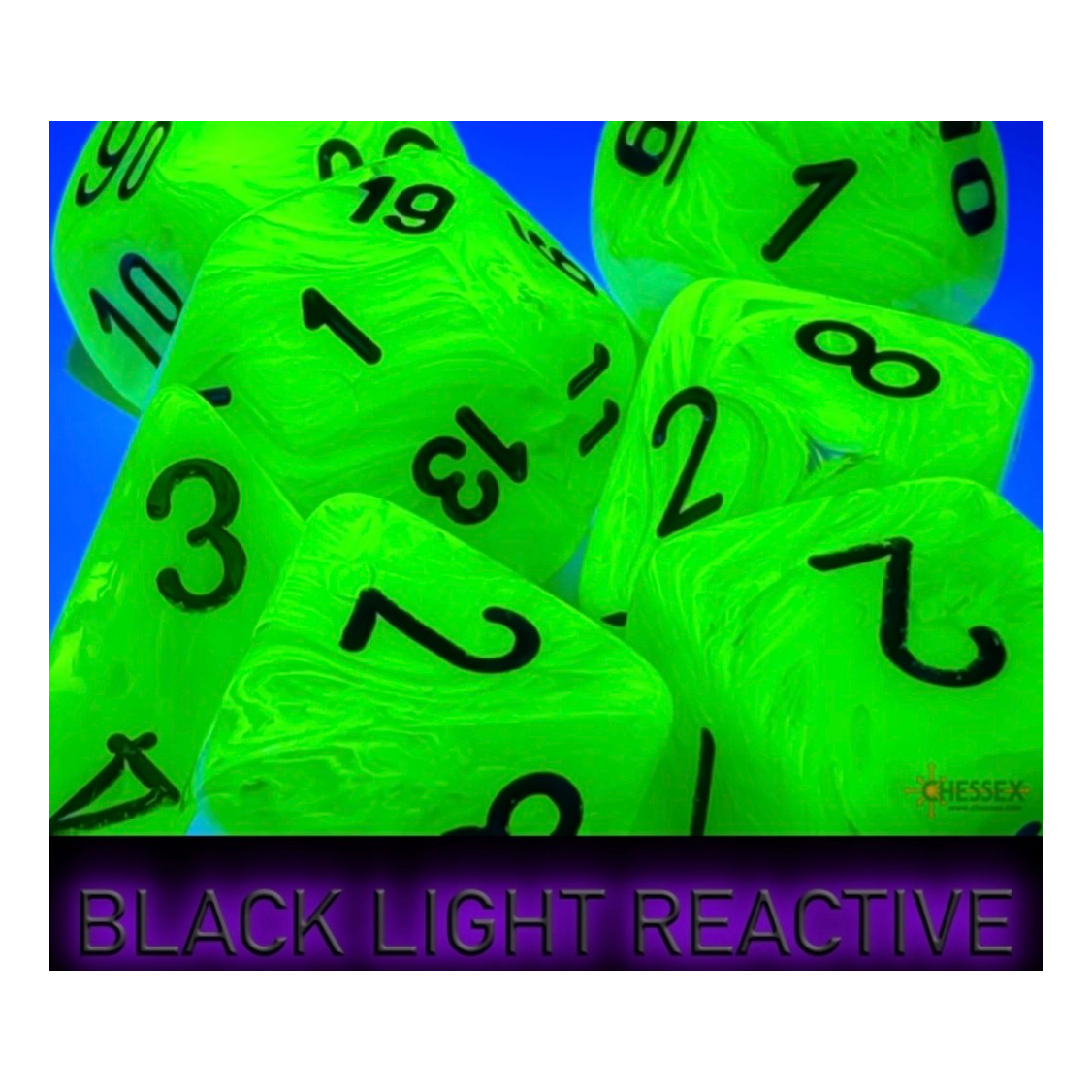 Contains 7 Vortex Bright Green Dice with black numbers.