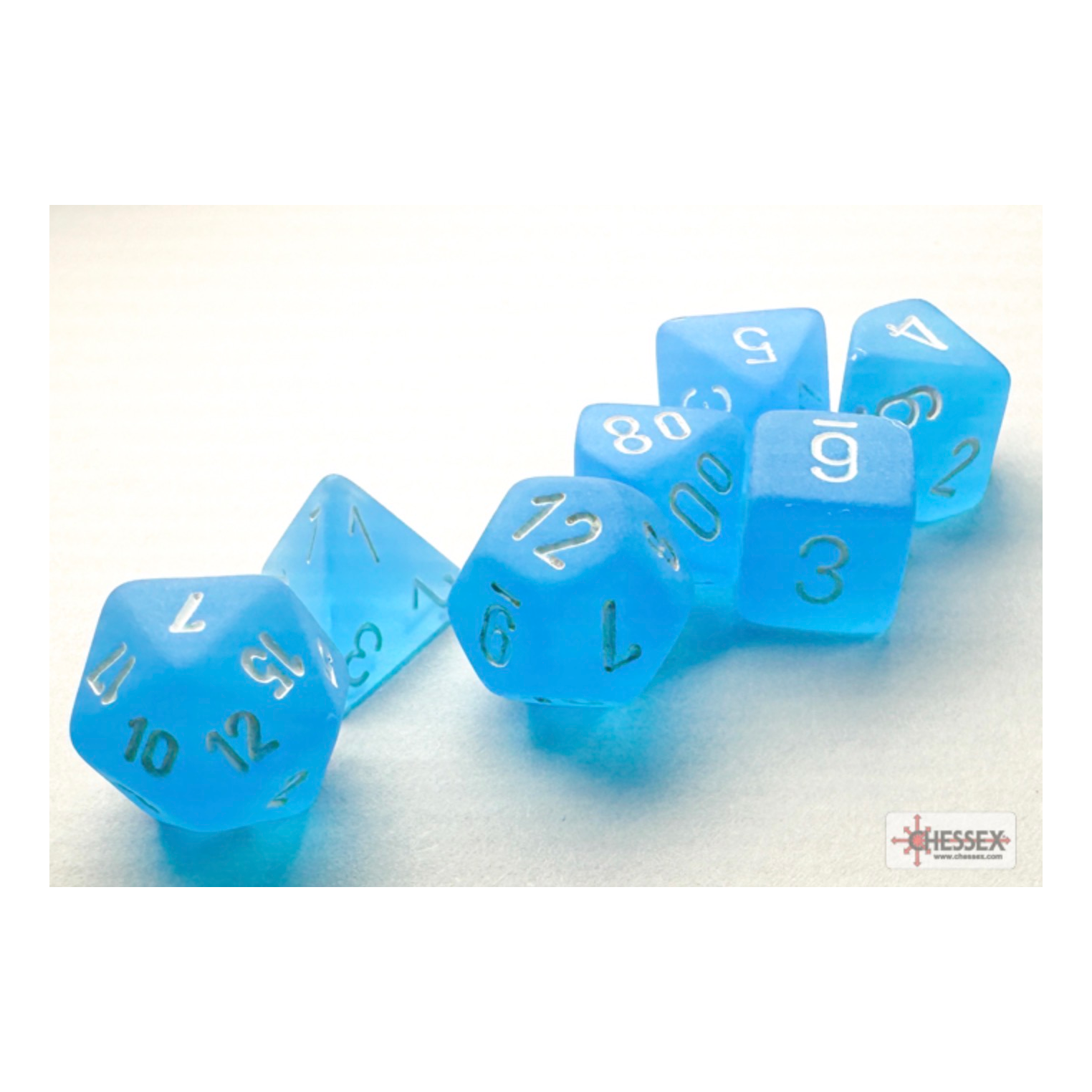 Contains 7 Frosted Carribean Blue Dice with white numbers in the following Shapes: