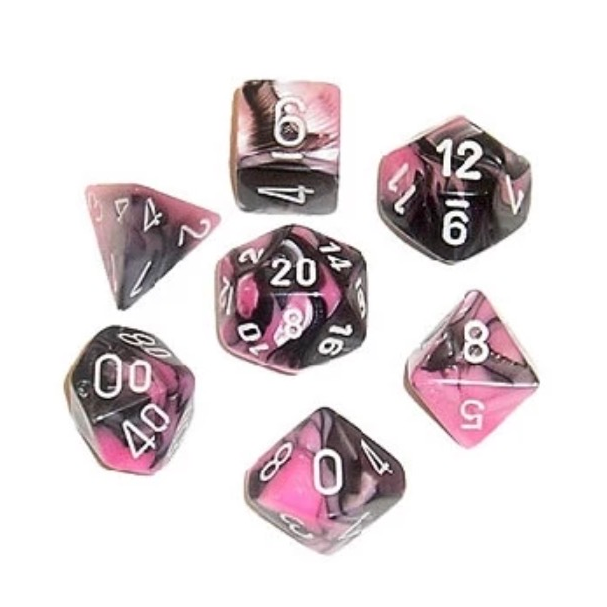 73470Chessex – Mini Polyhedral Sets & Bags Gemini® Mini-Polyhedral Black-Pink/white 7-Die Set (CHX20630) (CHX20630)