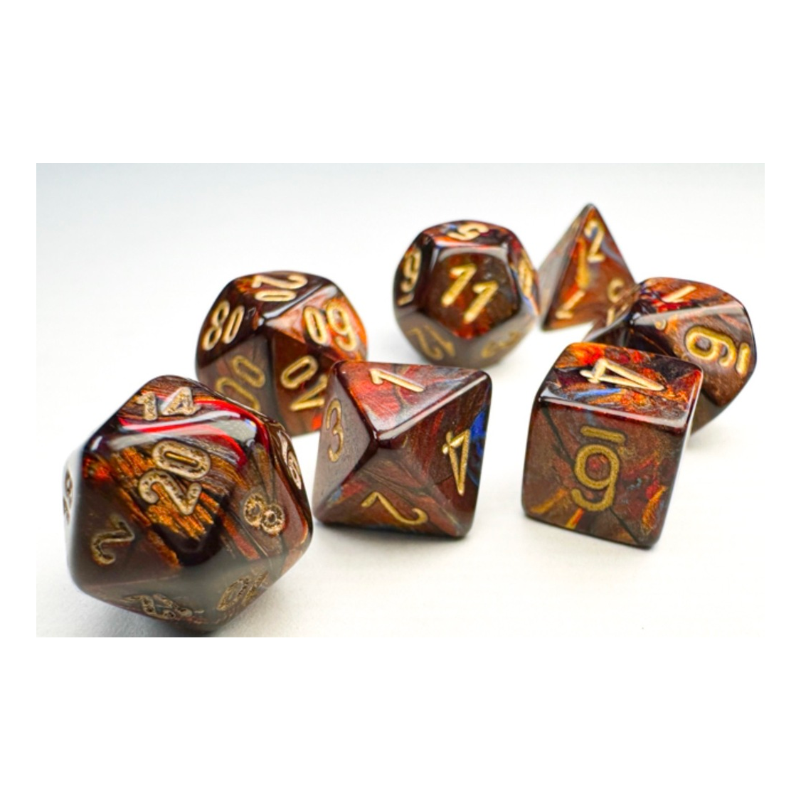 Contains 7 Scarab Blue Blood Dice with gold numbers in the following Shapes: