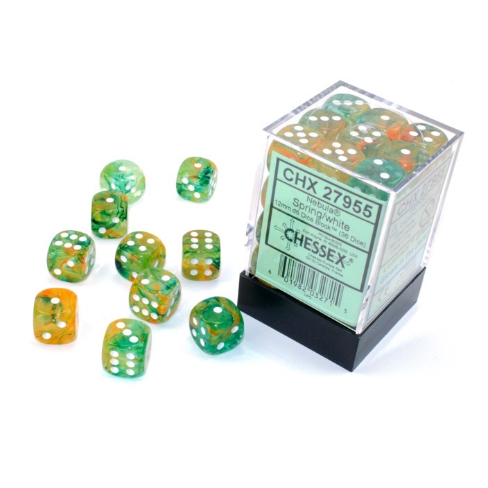 Each Set contains 36 Nebula Spring 12mm d6 dice with white pips (DN1255) in 02804 Display Case w/Lid This color has our Luminaryâ„¢ effect. It can look like stars in the dark (with enough light exposure beforehand or under a black light).