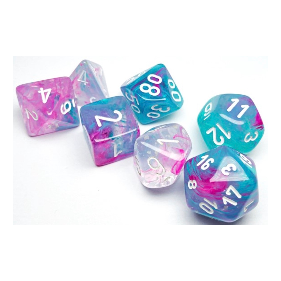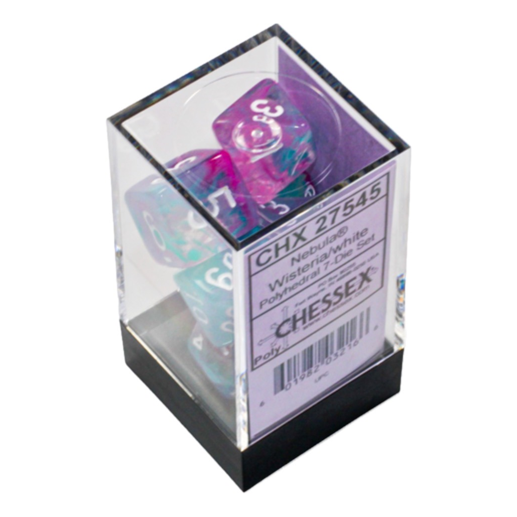 This set contains 7 Nebula Wisteria dice with white numbers with the following shapes: