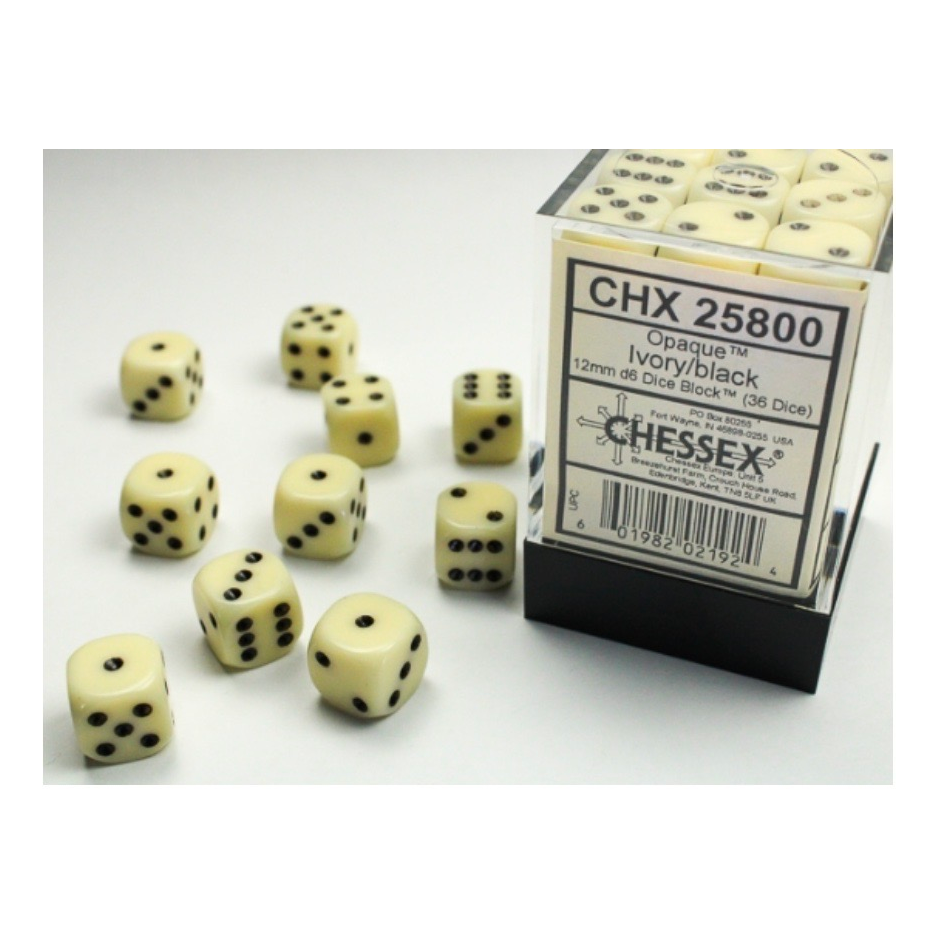 Chessex – Opaque Ivory/black 12mm d6 Dice Block (36 dice) (CHX25800)