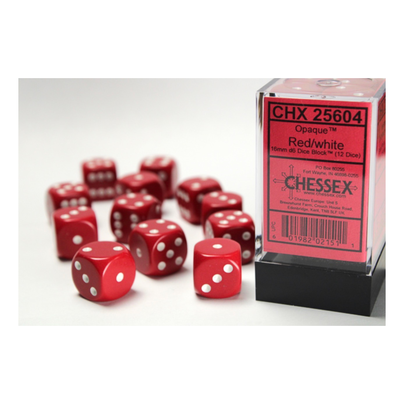 Chessex – Opaque Red/white 16mm d6 Dice Block (12 dice) (CHX25604)