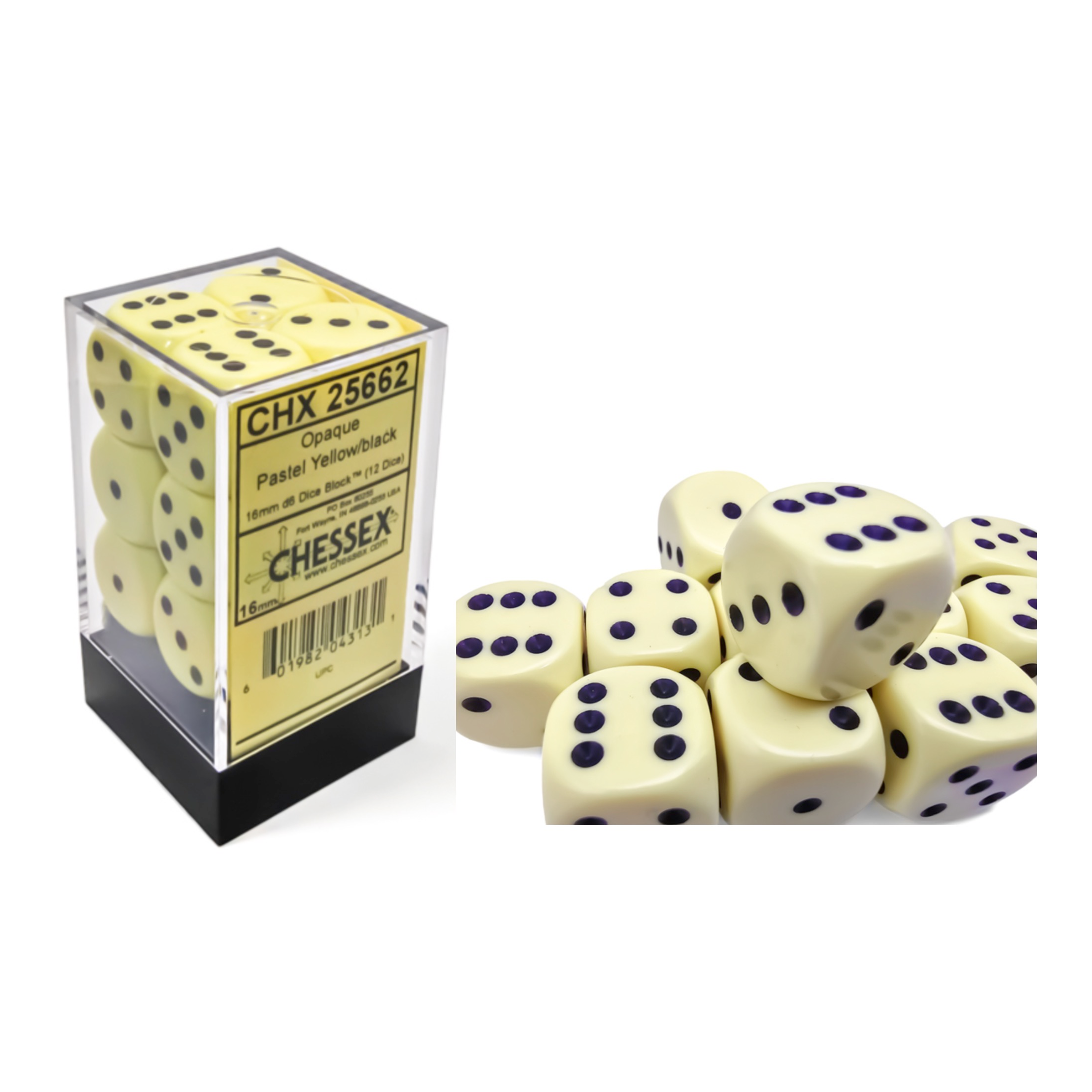 Chessex – Pastel Opaque Set Opaque 16mm d6 Pastel Yellow/black Dice Block™ (12 dice) (CHX25662)