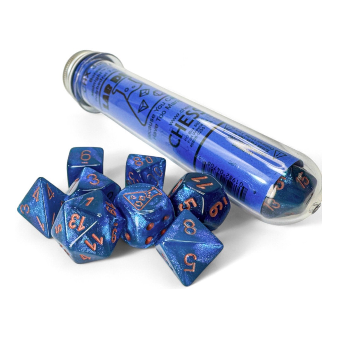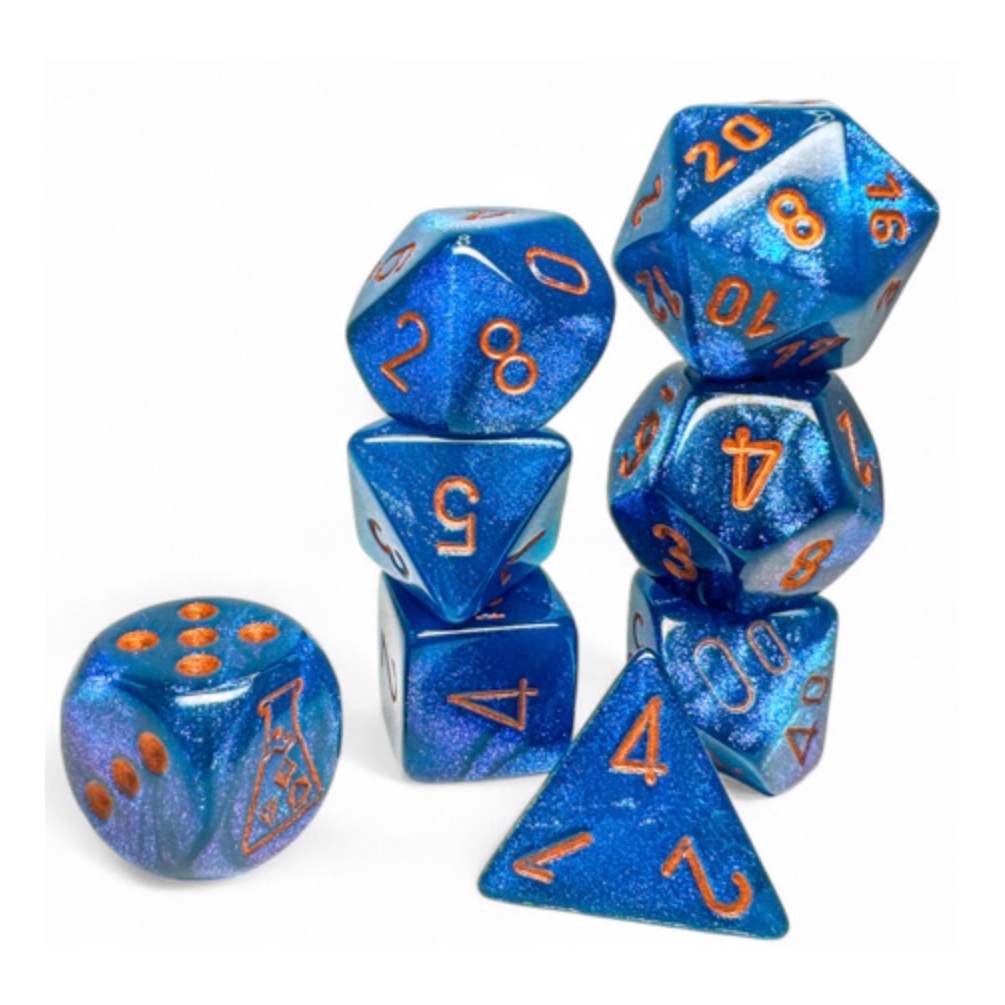 This set contains 8 Borealis® Midnight™ dice with copper numbers with the following shapes: