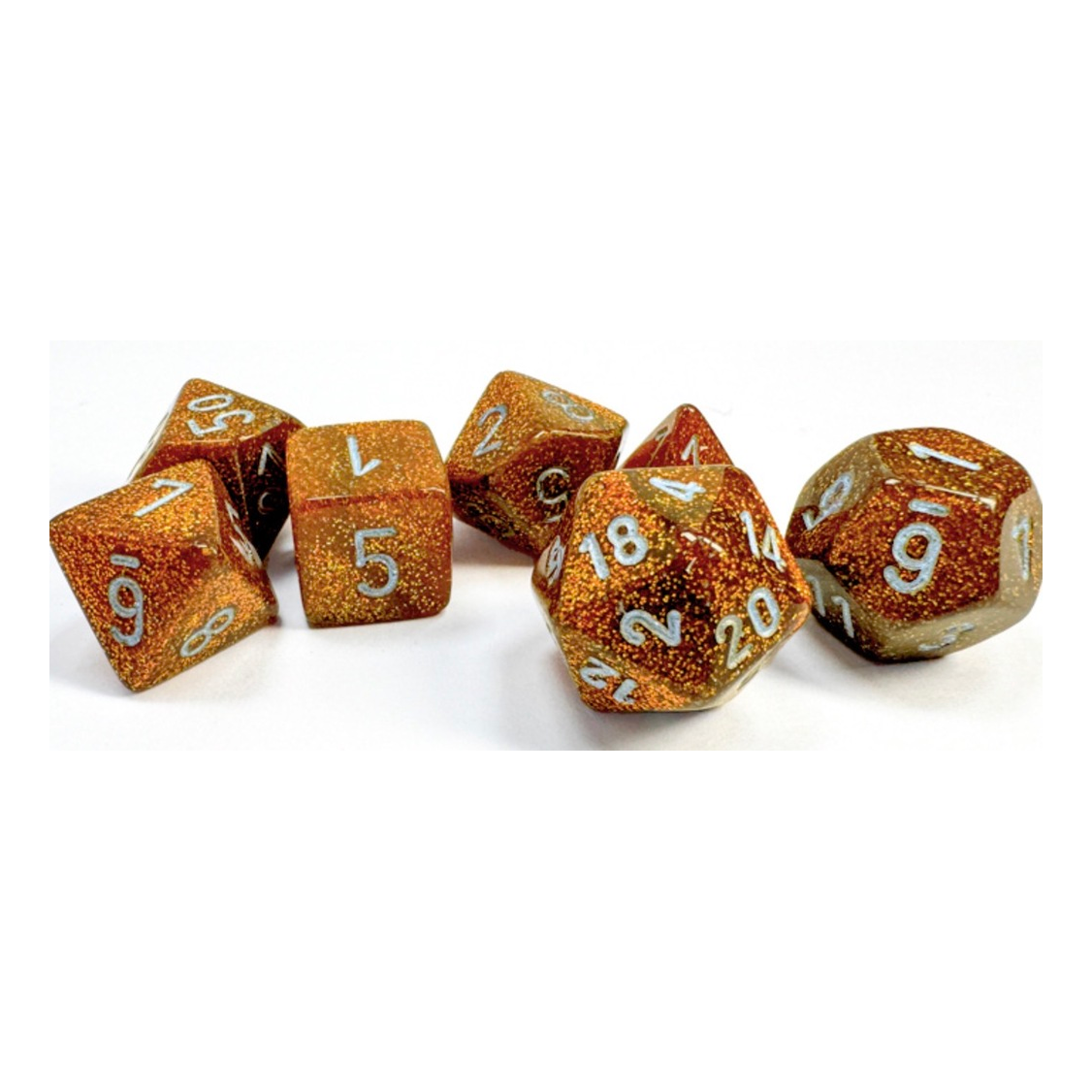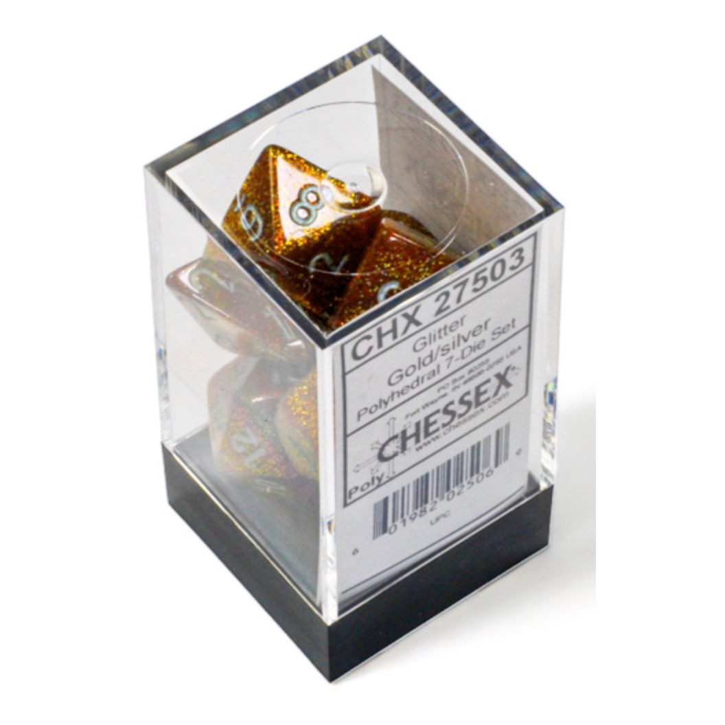 This set contains 7 Glitter Gold dice with silver numbers with the following shapes: