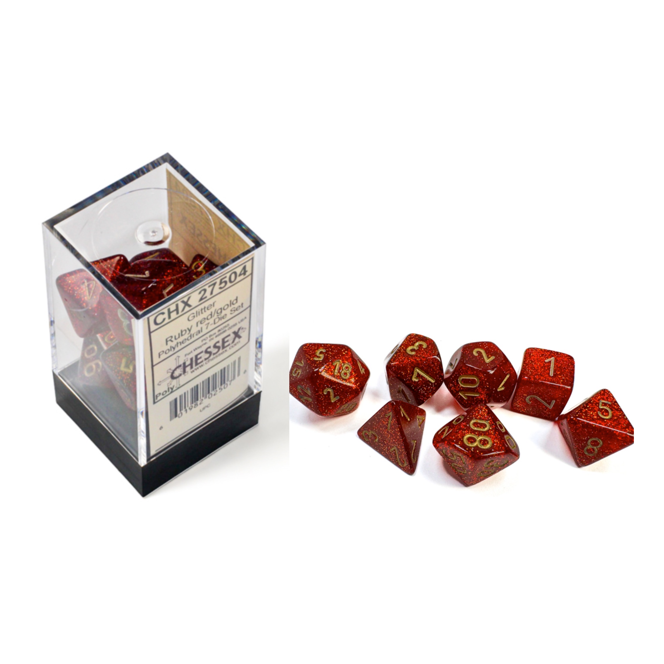 This set contains 7 Glitter Ruby dice with gold numbers.