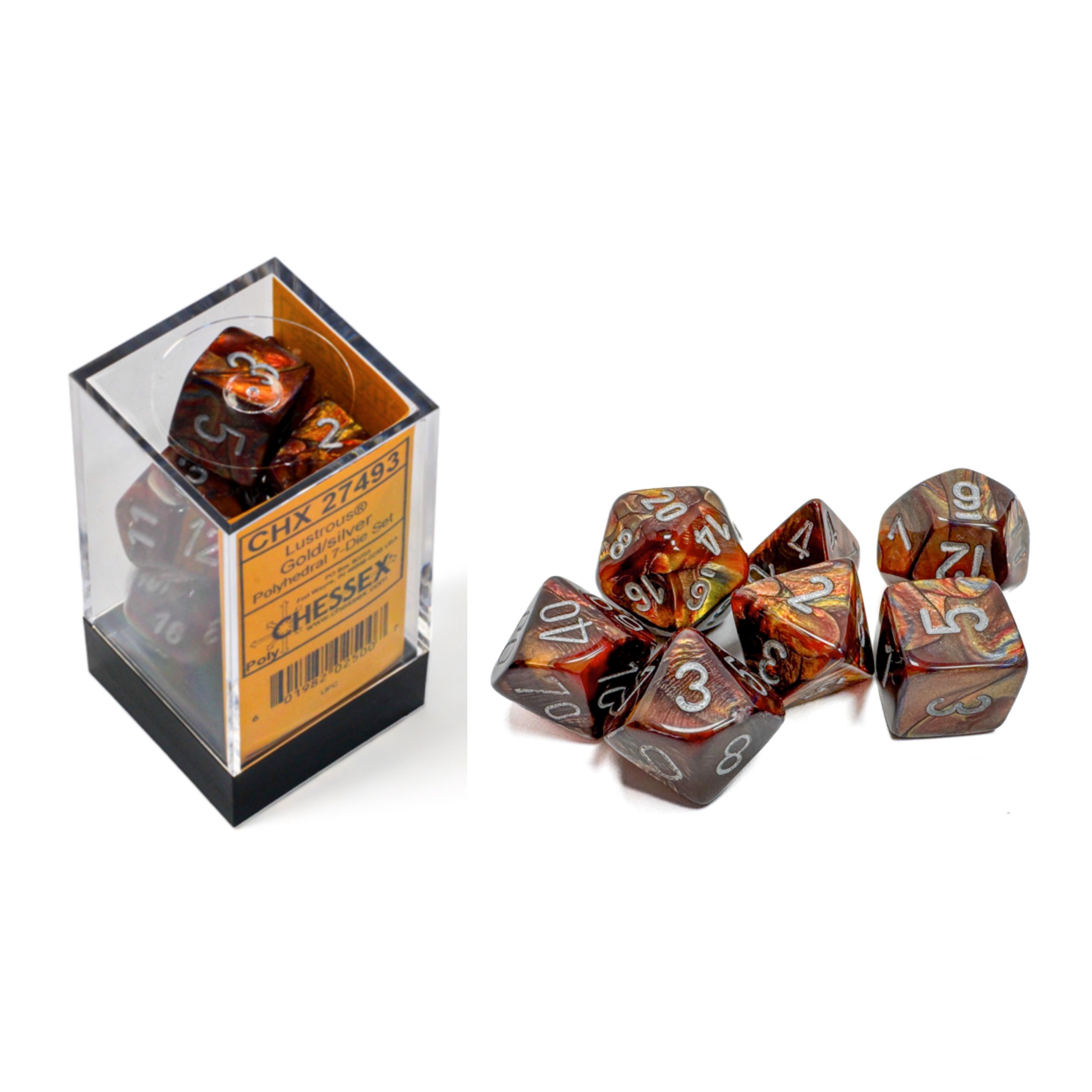 This set contains 7 Lustrous Gold dice with silver numbers.