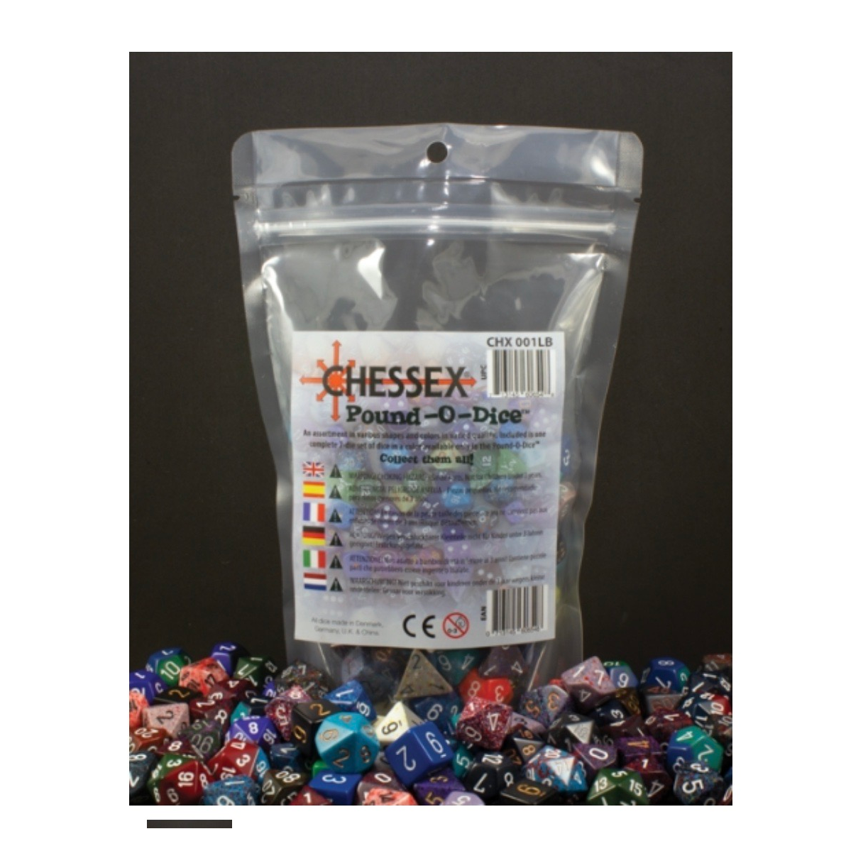 Looking for an inexpensive way to increase your dice collection? The Pound-O-Dice™ is the perefect solution. Each pound has approximately 100 dice in assorted shapes and colors with quantities weighted in favor of d6’s, d10’s, and d20’s. Also included is a full 7-die set randomly selected, specially made polyhedral dice that are only available in this product.