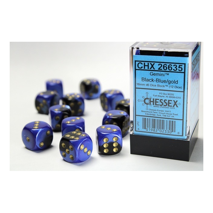 Each set contains 12 Gemini Black-Blue 16mm d6 dice with gold pips (DG1635) in 02805 Display Case w/Lid and Foam Square