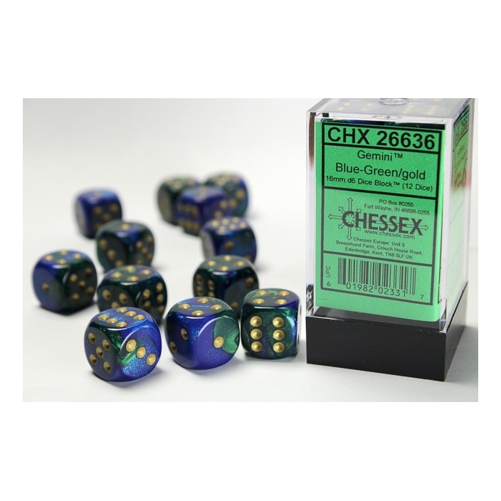 Each set contains 12 Gemini Blue-Green 16mm d6 dice with gold pips (DG1636) in 02805 Display Case w/Lid and Foam Square