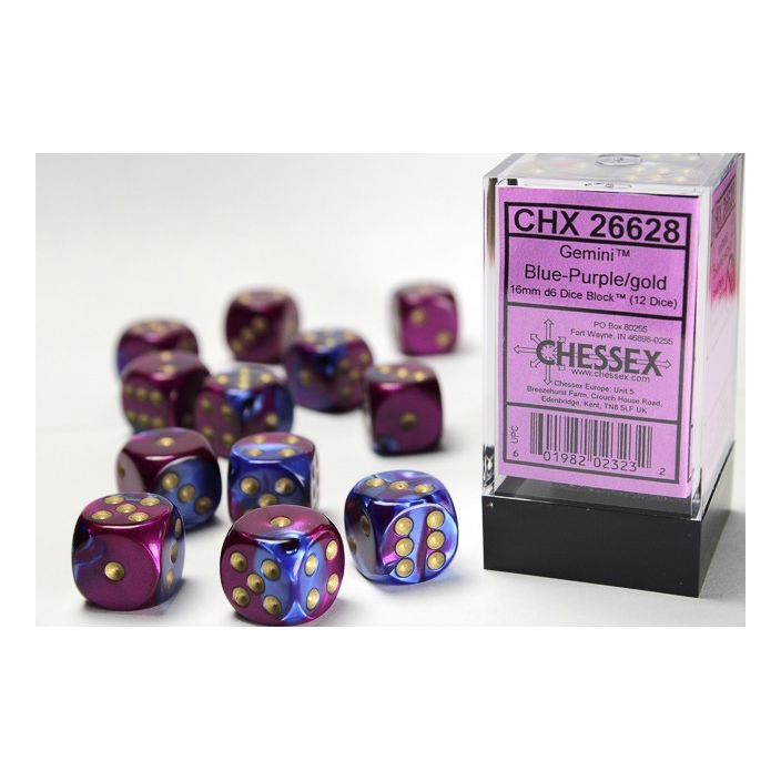 Each set contains 12 Gemini Blue-Purple 16mm d6 dice with gold pips (DG1628) in 02805 Display Case w/Lid and Foam Square