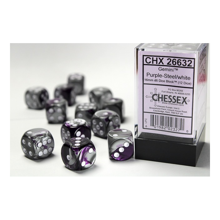 Each set contains 12 Gemini Purple-Steel 16mm d6 dice with white pips (DG1632) in 02805 Display Case w/Lid and Foam Square