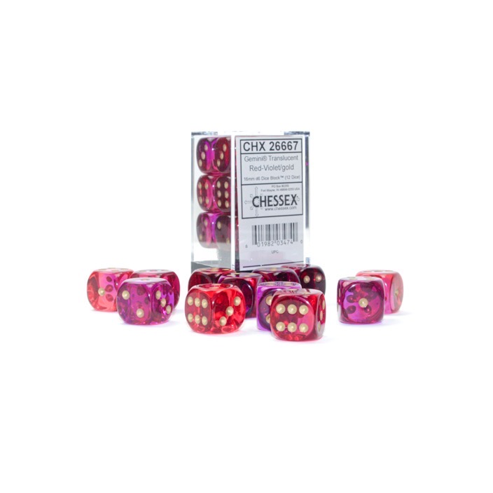 Each set contains 12 Gemini Translucent Red-Violet 16mm d6 dice with gold pips (DG1667) in 02805 Display Case w/Lid and Foam Square