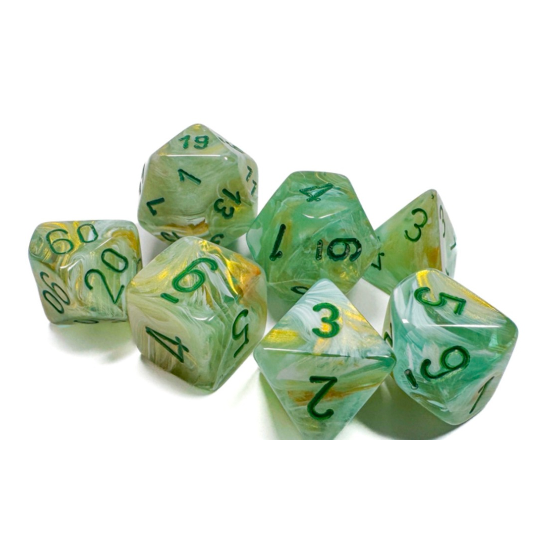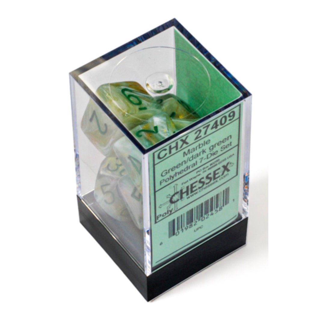This set contains 7 Marble Green dice with dark green numbers with the following shapes: