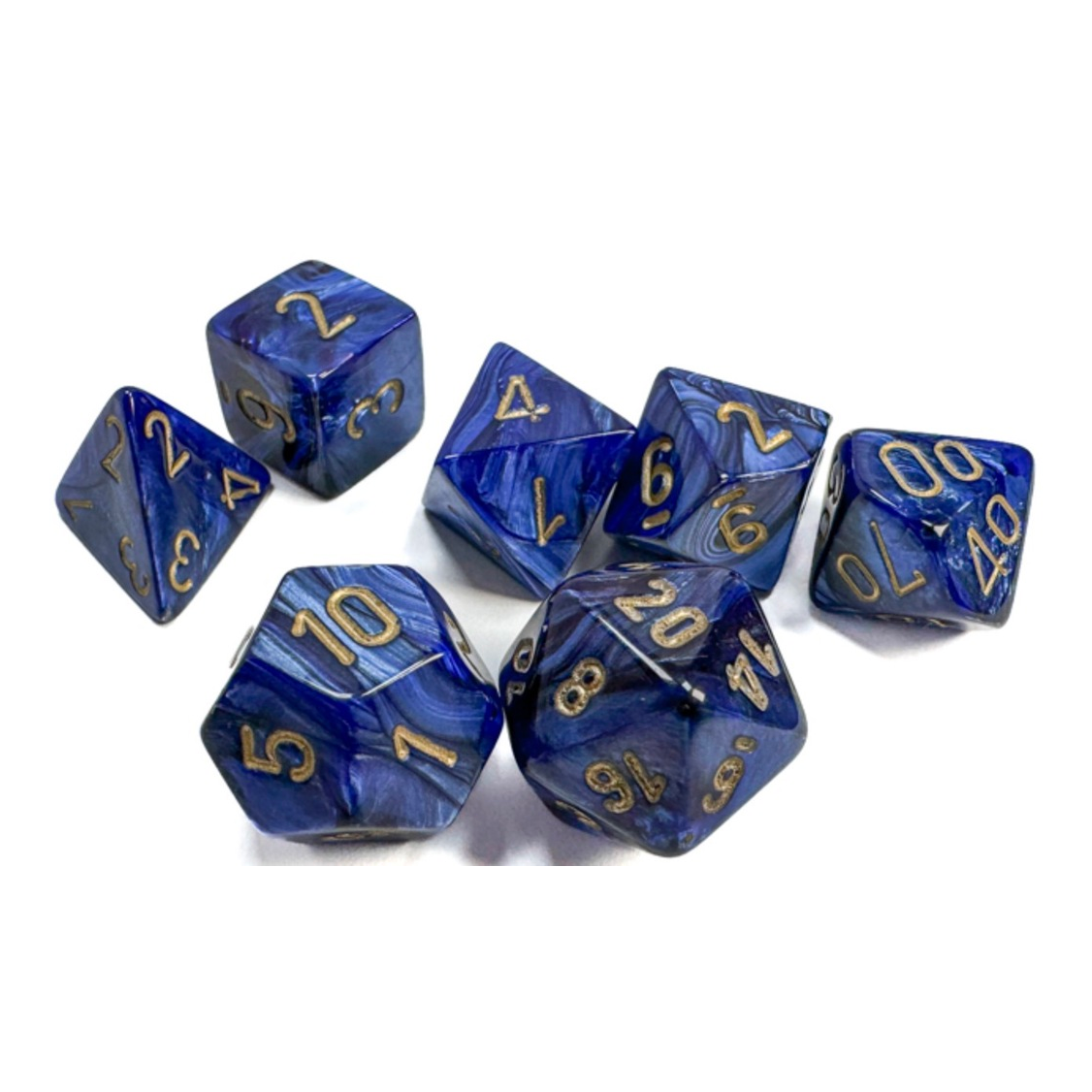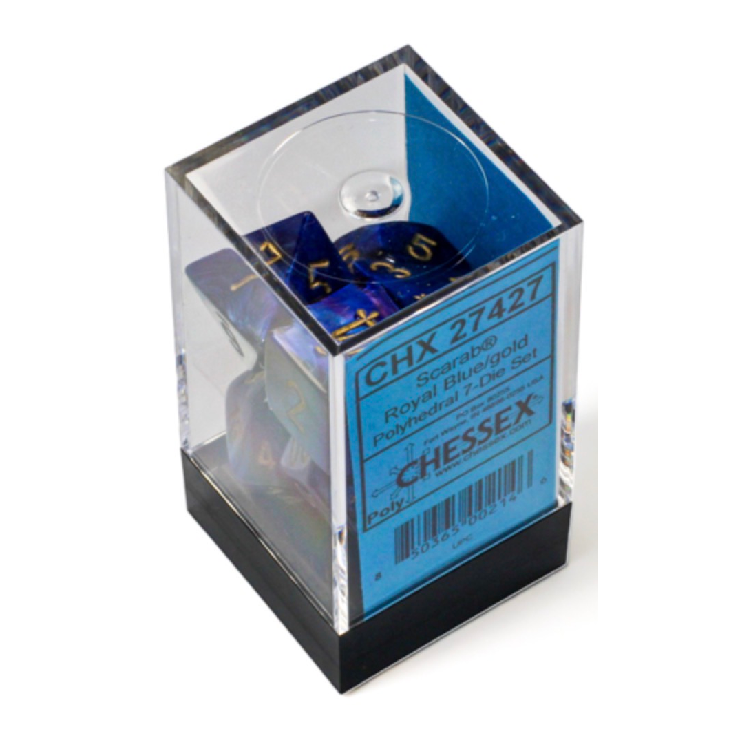 This set contains 7 Scarab Royal Blue dice with gold numbers with the following shapes: