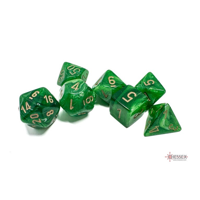 This set contains 7 Vortex Green dice with gold numbers with the following shapes: