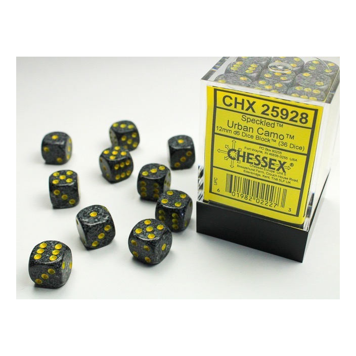 Each Set contains 36 Speckled Urban Camo 12mm d6 dice with yellow pips (DS1292) in 02804 Display Case w/Lid