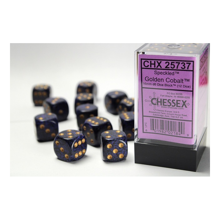 Each set contains 12 Speckled Cobalt 16mm d6 dice with gold pips (DS1693) in 02805 Display Case w/Lid and Foam Square