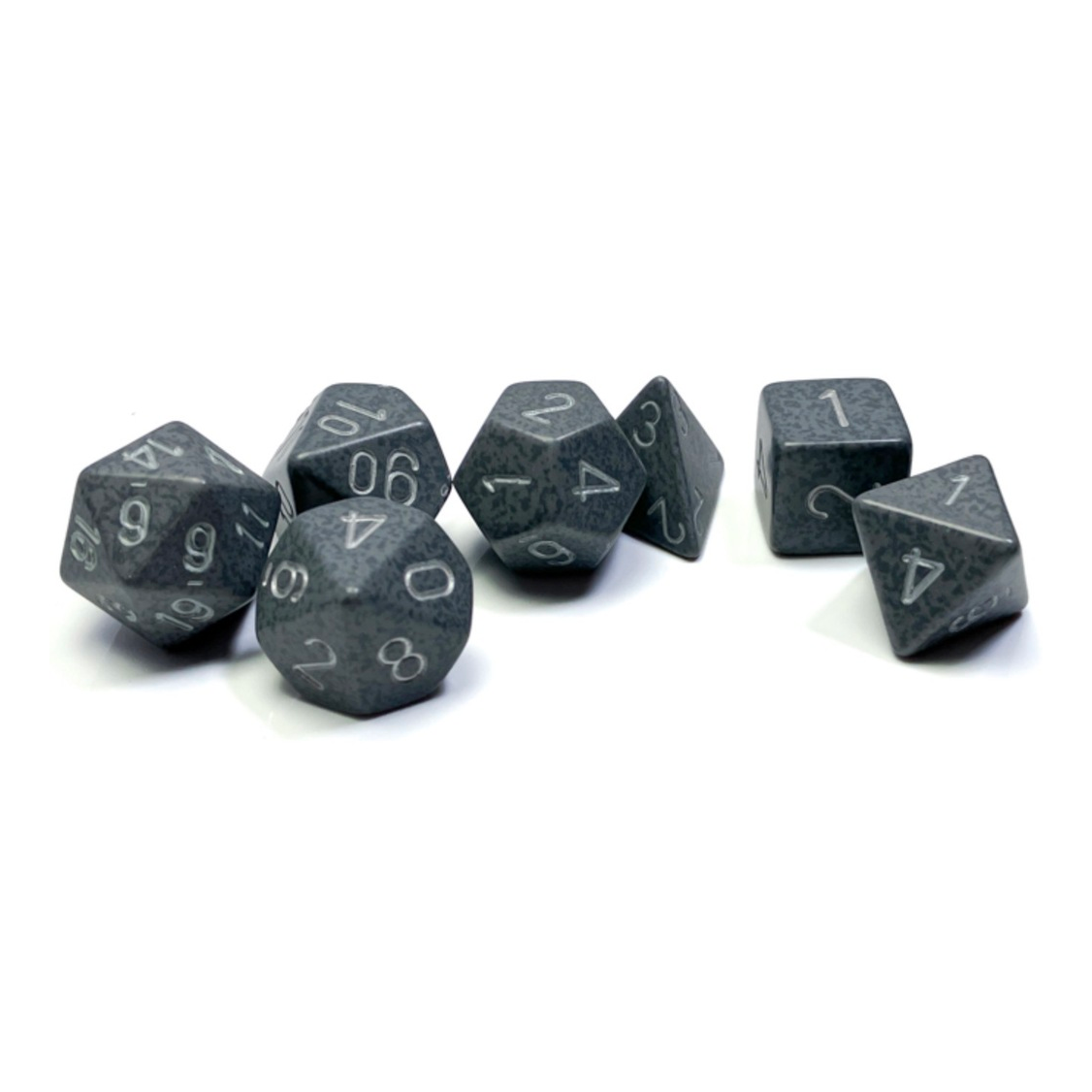 This set contains 7 Speckled Hi-Tech dice with silver numbers