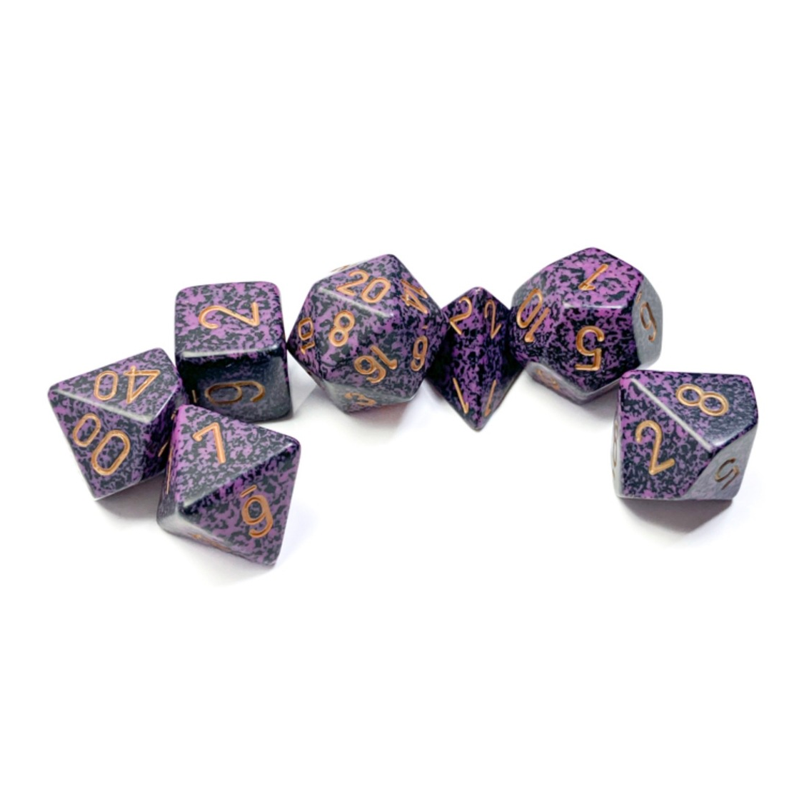 This set contains 7 Speckled Hurricane dice with gold numbers