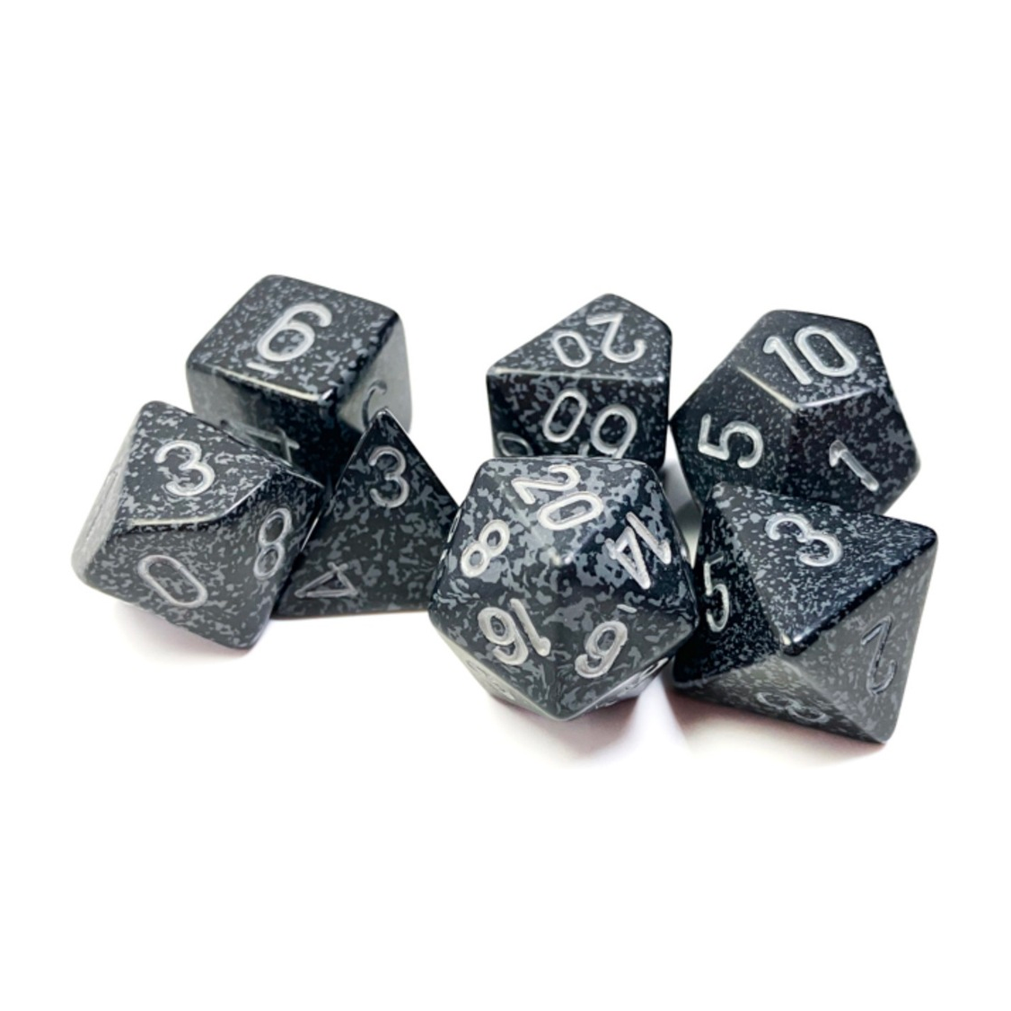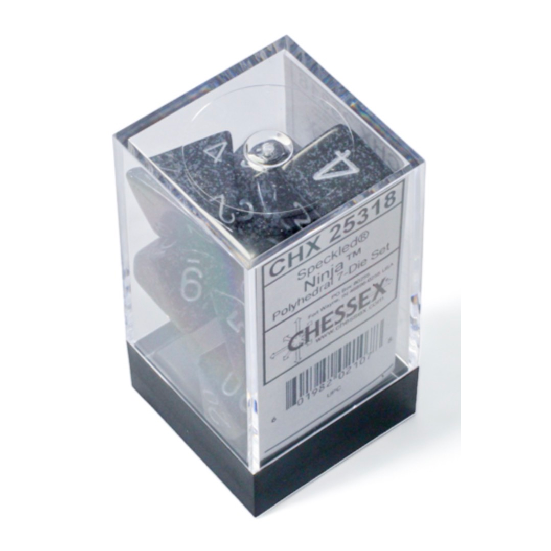 This set contains 7 Speckled Ninja dice with silver numbers
