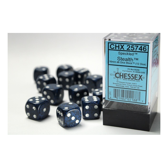 Each set contains 12 Speckled Stealth 16mm d6 dice with white pips (DS1691) in 02805 Display Case w/Lid and Foam Square