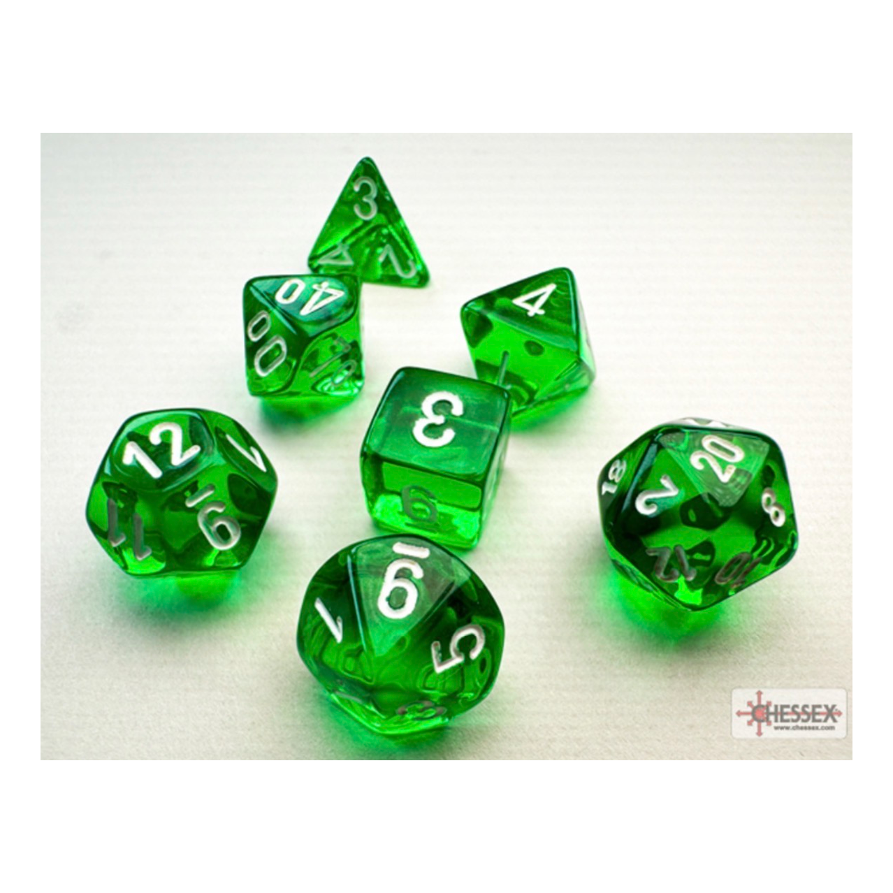 Contains 7 Translucent Green Dice with white numbers in the following Shapes: