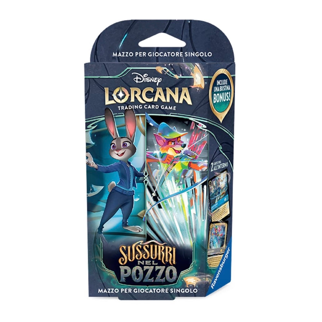 Entra nel mistero di Sussurri nel Pozzo con lo Starter Deck Acciaio/Zaffiro: un mazzo precostruito da 60 carte pensato per farti giocare subito, perfetto se desideri iniziare a Lorcana senza passare dalla costruzione del deck. Le due carte protagoniste nella versione foil brillano in campo e in collezione, mentre il booster incluso dell’espansione Sussurri nel Pozzo ti permette di personalizzare la lista fin dal primo giorno, aggiungendo nuove sinergie e potenziamenti mirati.