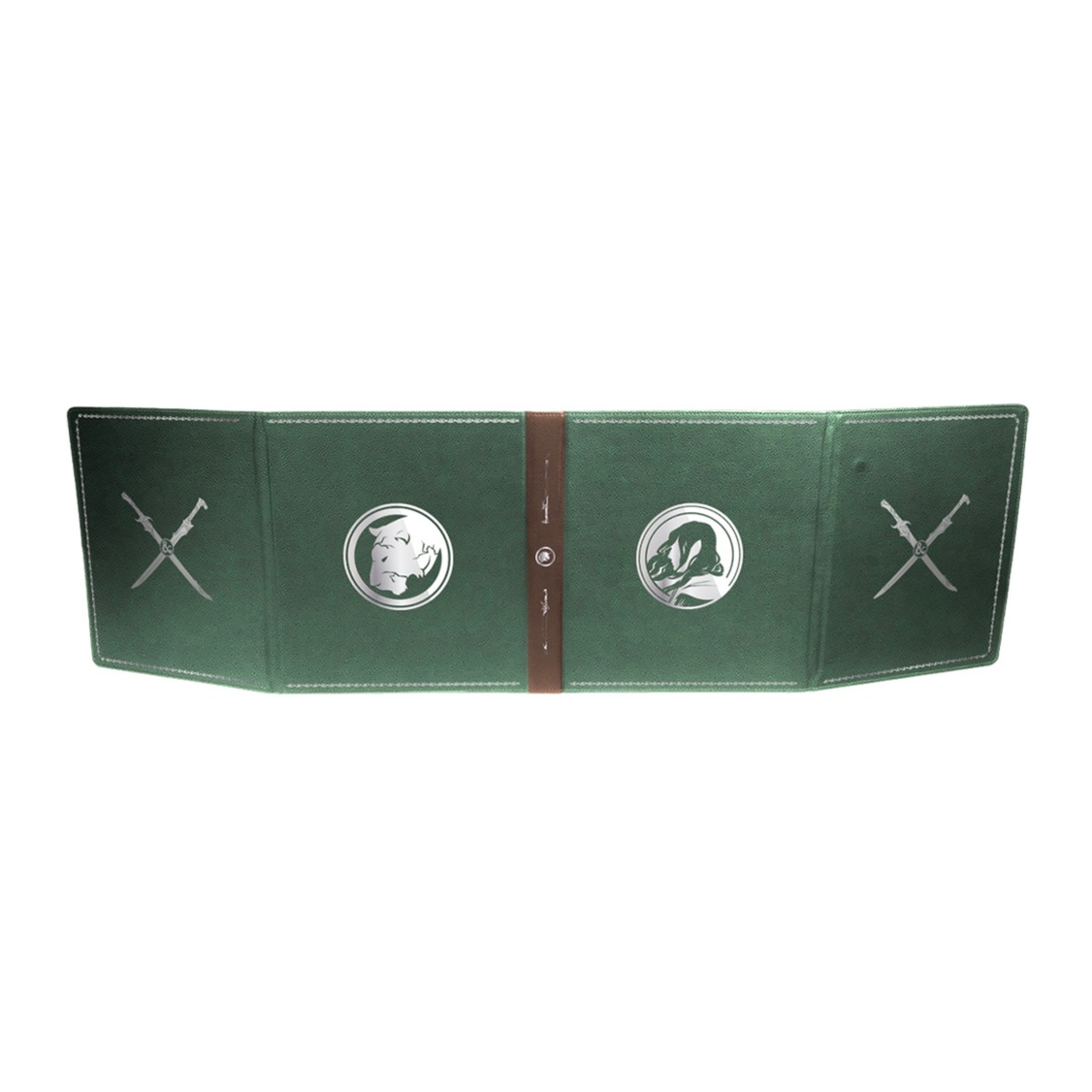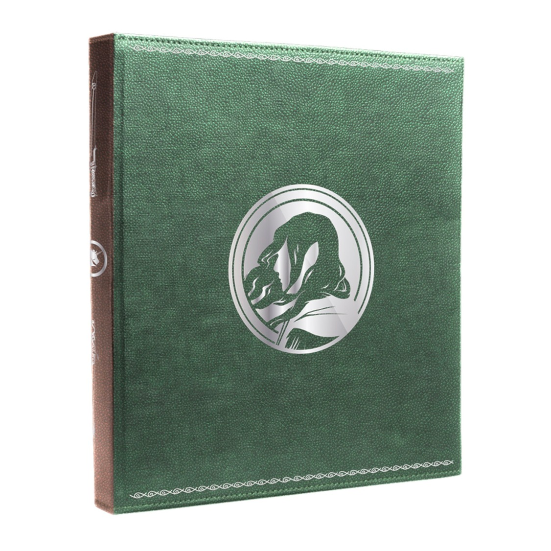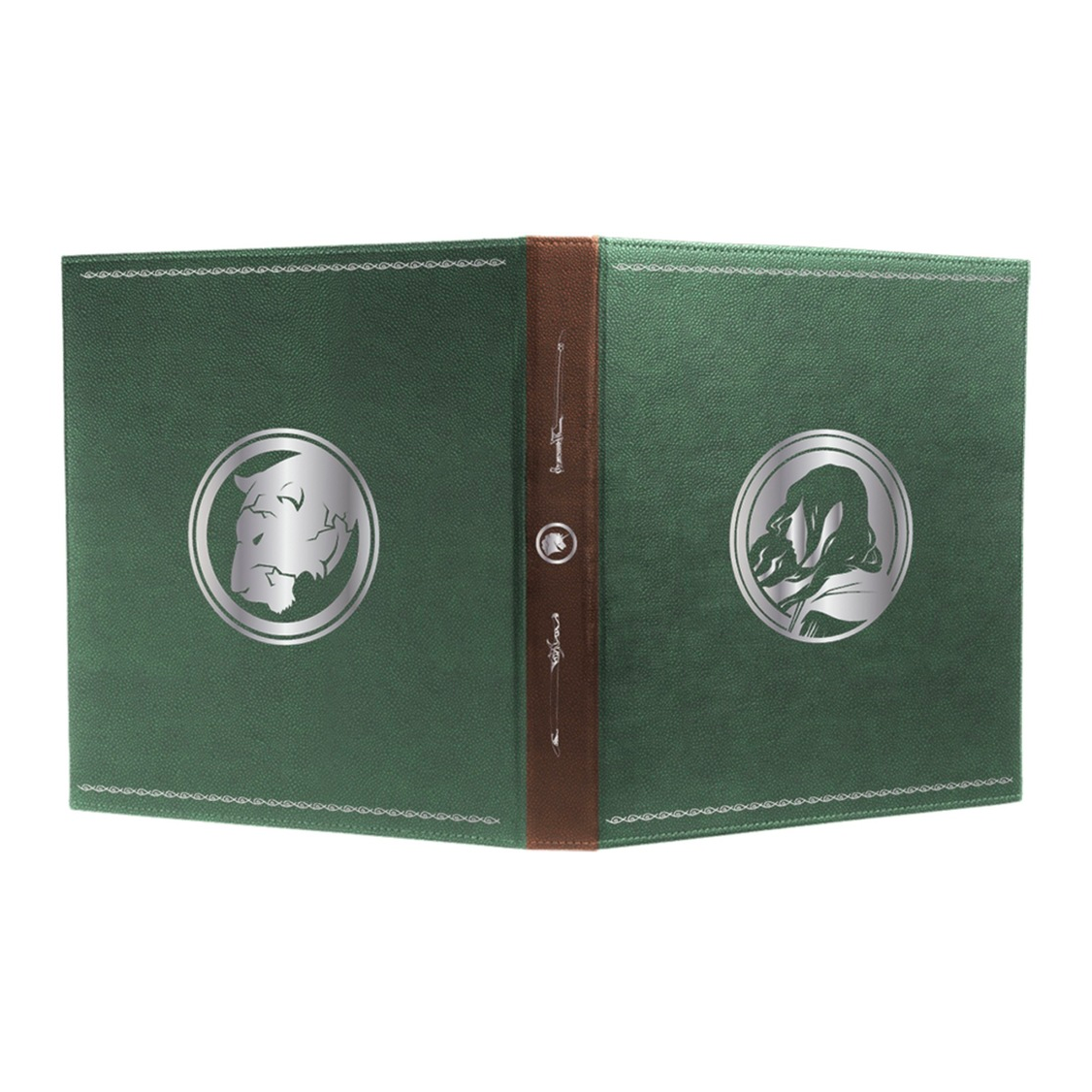 – Sage green and brown leatherette exterior with silver foil accents and soft suede interior featuring original Forgotten Realms cartography art by Deven Rue