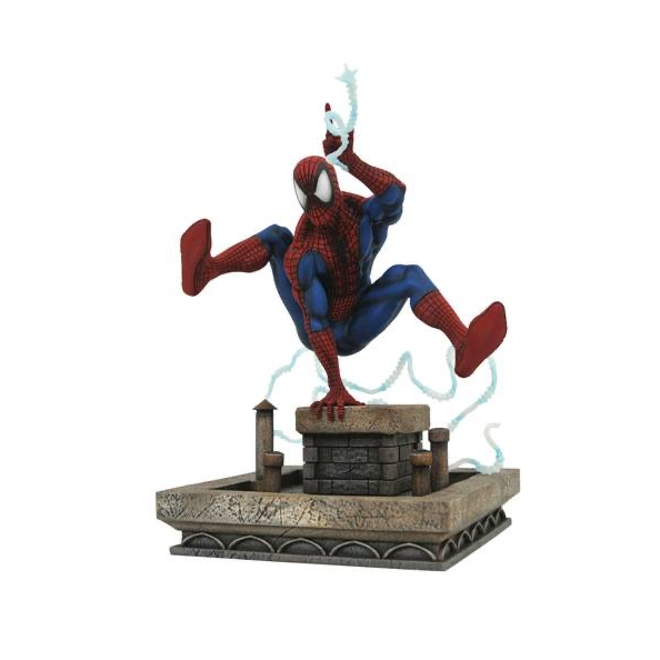 PVC Diorama inspired by classic Spider-Man artwork of the early 90s! Leaping over a rooftop with his webline wrapped around him, this sculpture of Spidey stands approximately 20 cm tall and is case in high grade PVC with highly detailed sculpting and paint applications.