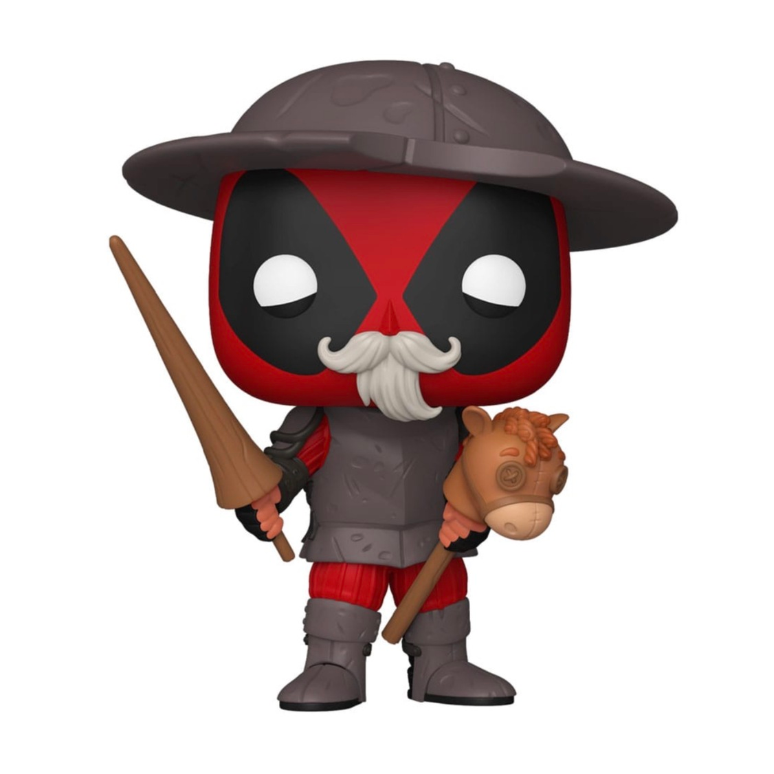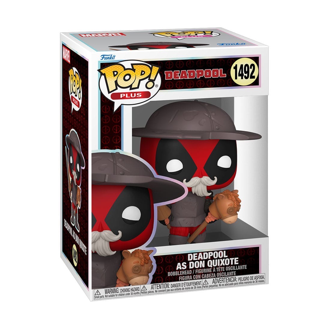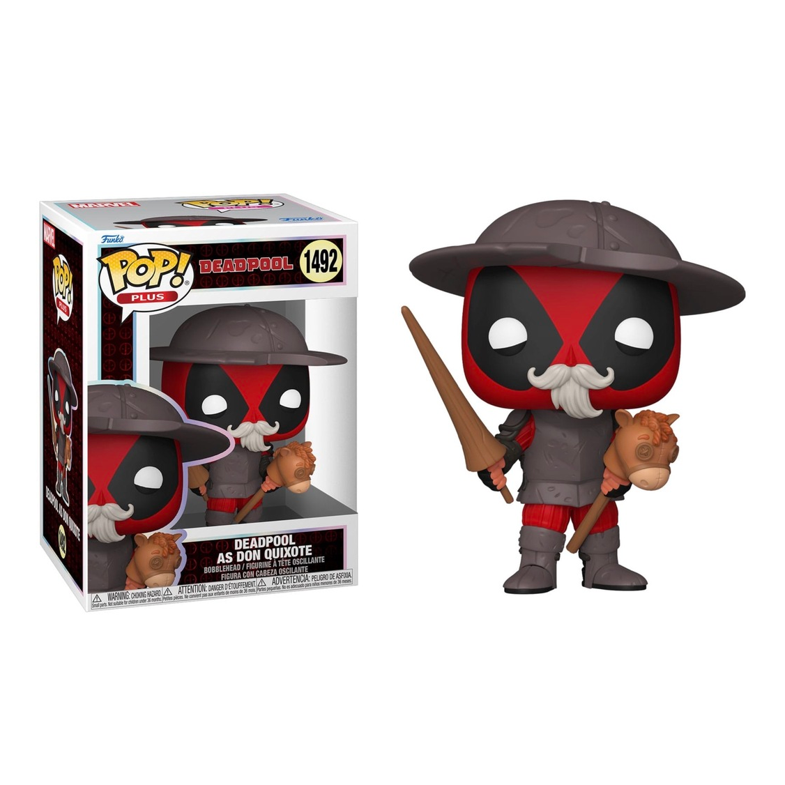 This Deadpool Literary Classics Deadpool as Don Quixote Funko Pop! Vinyl Figure Plus measures approximately 10 cm tall and comes packaged in a window display box.