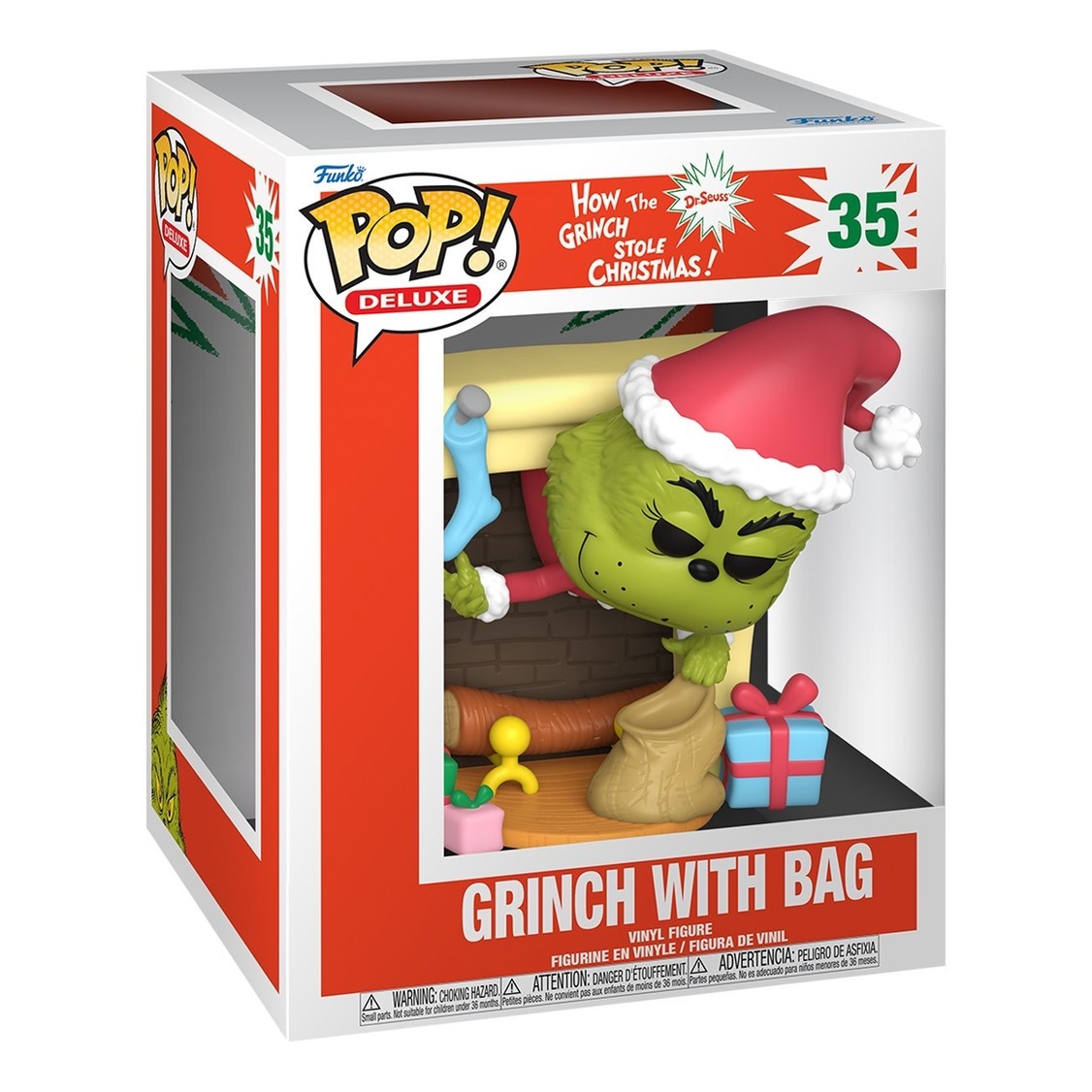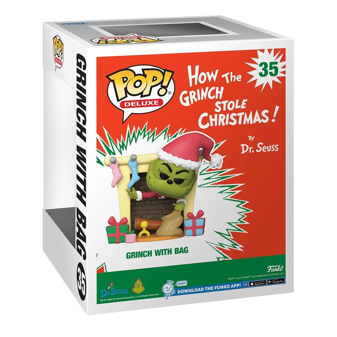 Commemorate this timeless Dr. Suess classic by growing your How the Grinch Stole Christmas Funko Pop! collection three times its size when you show this scheming Santa Claus imposter the true meaning of Christmas. This How the Grinch Stole Christmas Grinch with Bag Deluxe Funko Pop! Vinyl Figure measures approximately 11.6 cm tall and comes packaged in a window display box.
