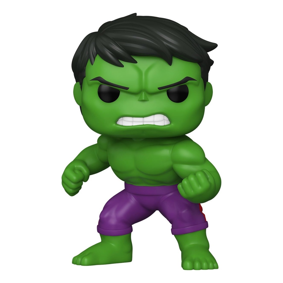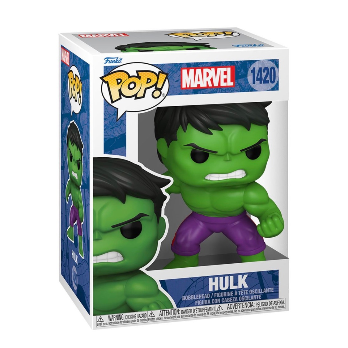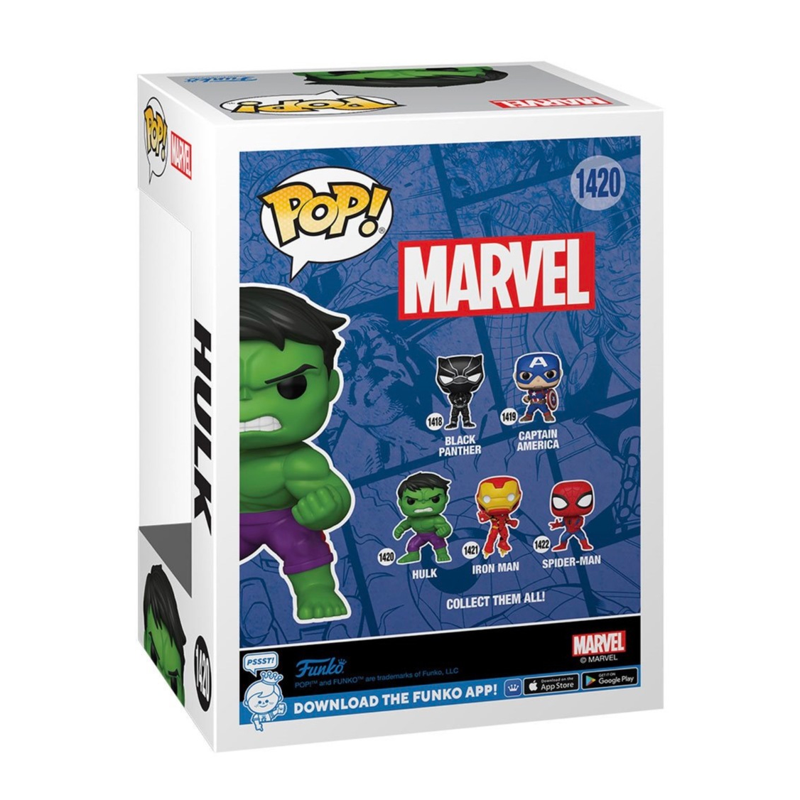 This Marvel New Classics Hulk Funko Pop! Vinyl Figure measures approximately 11 cm tall and comes packaged in a window display box.