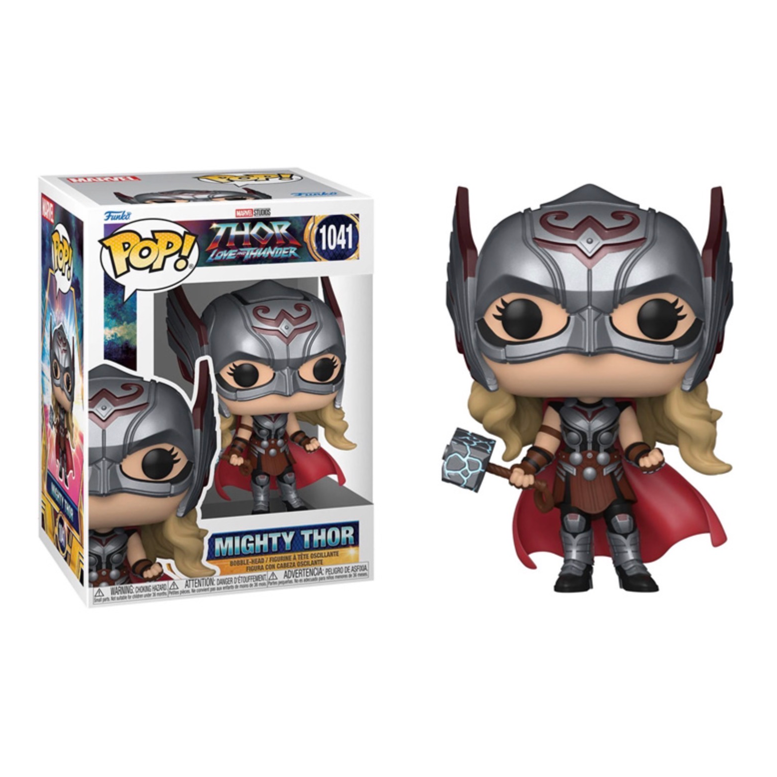 Mighty Thor Funko Pop! vinyl figure stands 9 cm tall and comes in window box packaging.