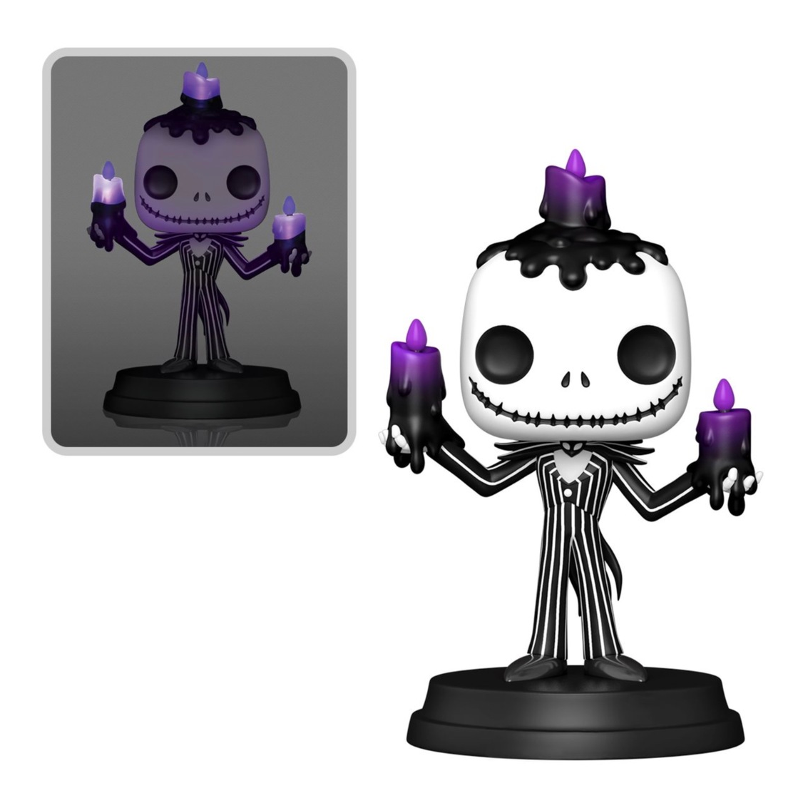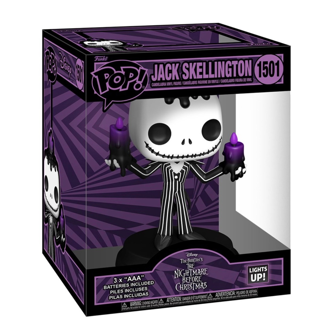 The Nightmare Before Christmas Jack Skellington Halloween Light-Up Super Funko Pop! Vinyl Figure #1501 measures approximately 15 cm tall and comes packaged in a window display box.