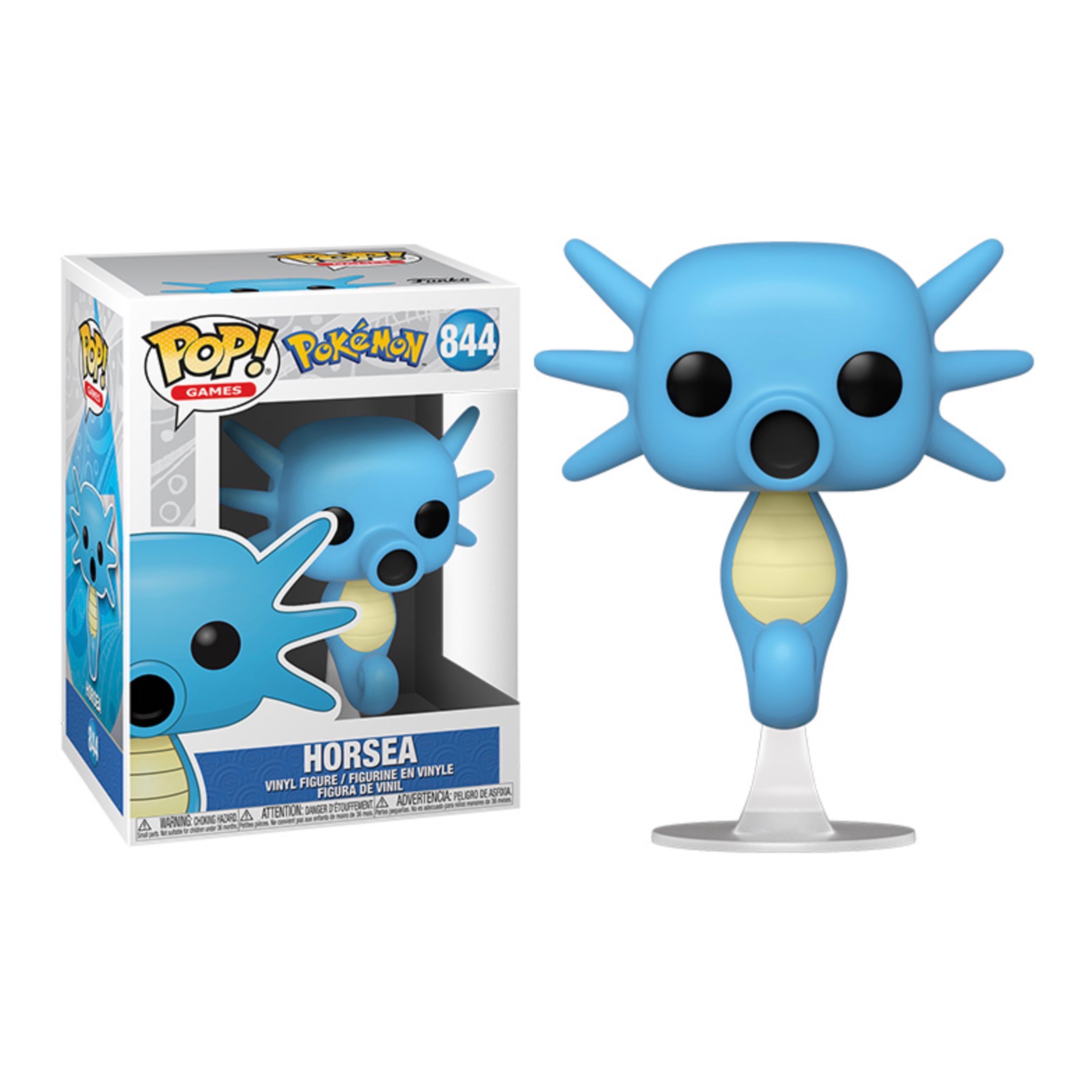 This Pokemon Horsea Pop! Vinyl Figure measures approximately 9 cm tall. Comes packaged in a window display box.
