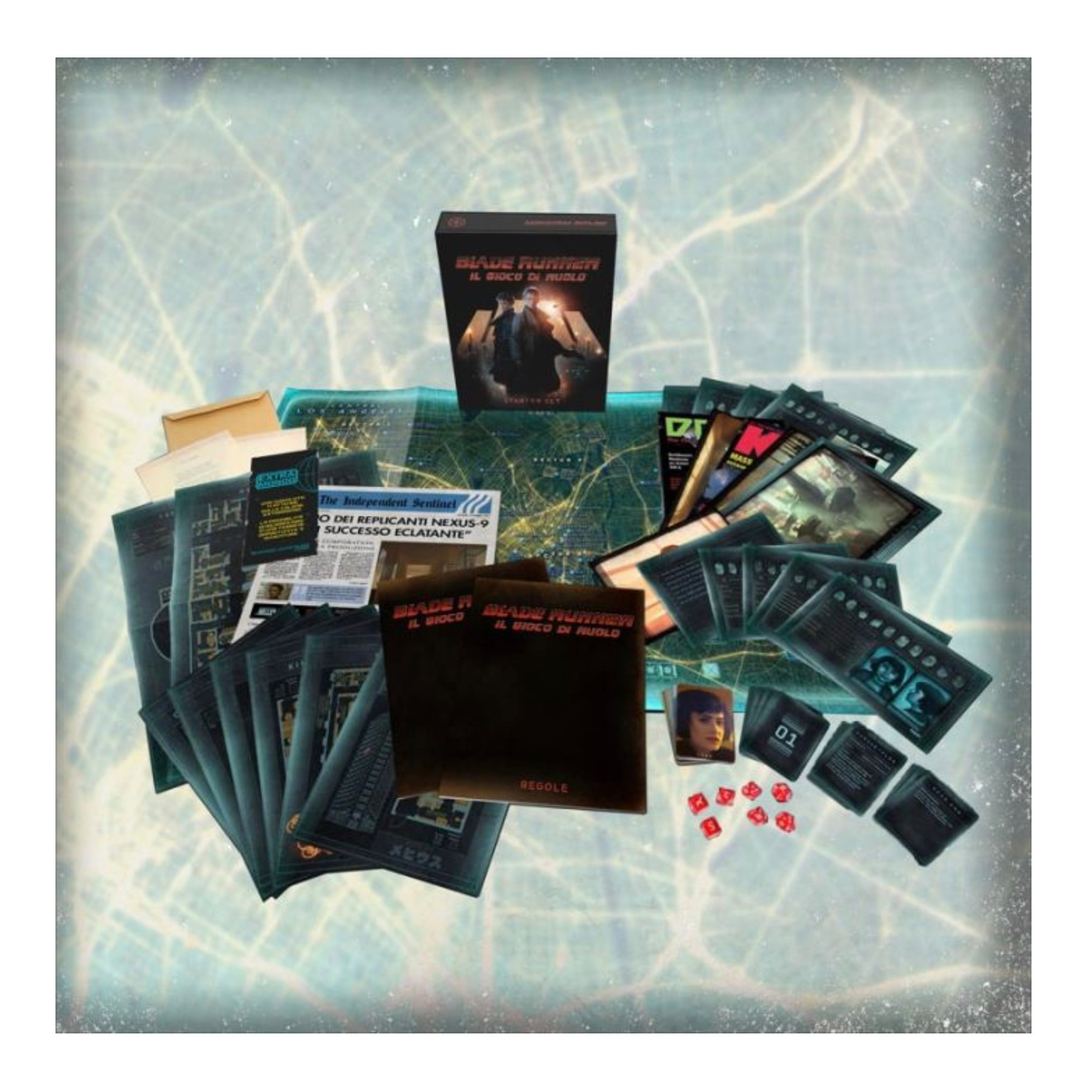 Questo è lo Starter Set per il Gioco di Ruolo ufficiale di BLADE RUNNER: un parco giochi al neon che vi toglierà il fiato, in un modo o nell’altro; un mondo evocativo di conflitti e contrasti, che osa porre le domande più difficili e affondare nel potere dell’empatia, nel veleno che è la paura e nel fardello di essere umani durante periodi disumani. Un set iconico e inclemente dalle infinite possibilità che vi strattonerà e vi mollerà un ceffone, intimandovi di svegliarvi. È tempo di vivere. O è tempo di morire. Questo set contiene tutto quello di cui avete bisogno per cominciare a giocare