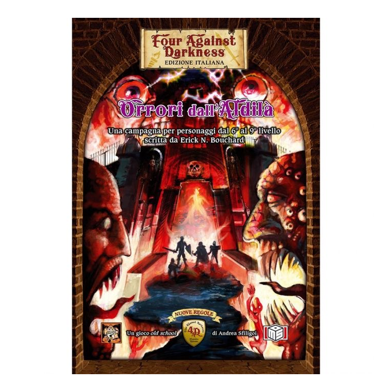 Orrori dall’Aldilà è la prima campagna ufficiale di Four Against Darkness, per personaggi dal 6° al 9° livello, che condurrà il tuo gruppo di avventurieri in una esplorazione su mappa esagonale del territorio ostile e mortal del mondo degli inferi, un luogo desolato governato da demoni ed creature indicibili.Cinque nuove classi sono a disposizione per affrontare i suoi pericoli, tutte sono specializzate proprio per questo tipo di avventura. Combatterete nuovi e terribili mostri, incluso un generatore di entità lovecraftiane che metterà a dura prova il coraggio dei vostri eroi.