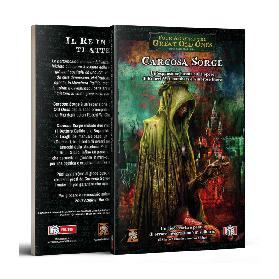 Carcosa Sorge è la prima espansione per Four against the Great Old Ones. Si basa principalmente sui materiali relativi ai Miti di Chambers e Bierce, tratti direttamente dalle fonti originali.