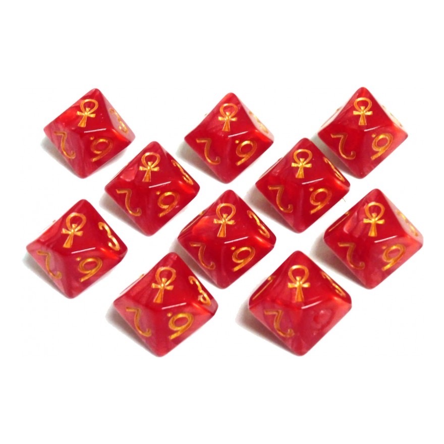 Set di 10 dadi a 10 facce Rosso perlato con numeri in Oro e design ispirato ai Vampiri con il simbolo dell’Ankh al posto del numero 1.